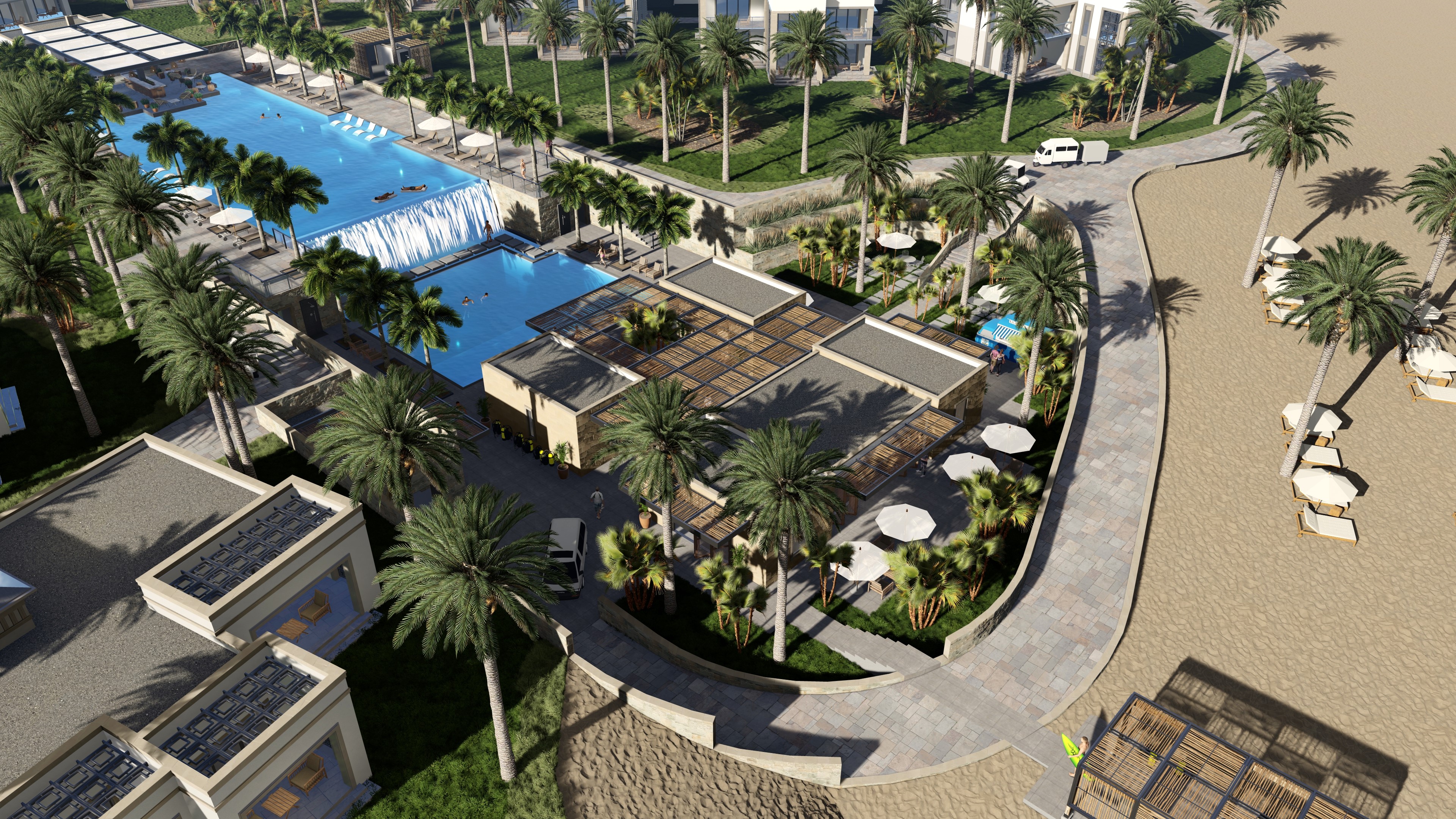 make the waterfall effect look more realistic and calm add a scuba dive class in the pool at the surface with a dive instructor make the stone walls look more realistic make the palm trees look more realistic