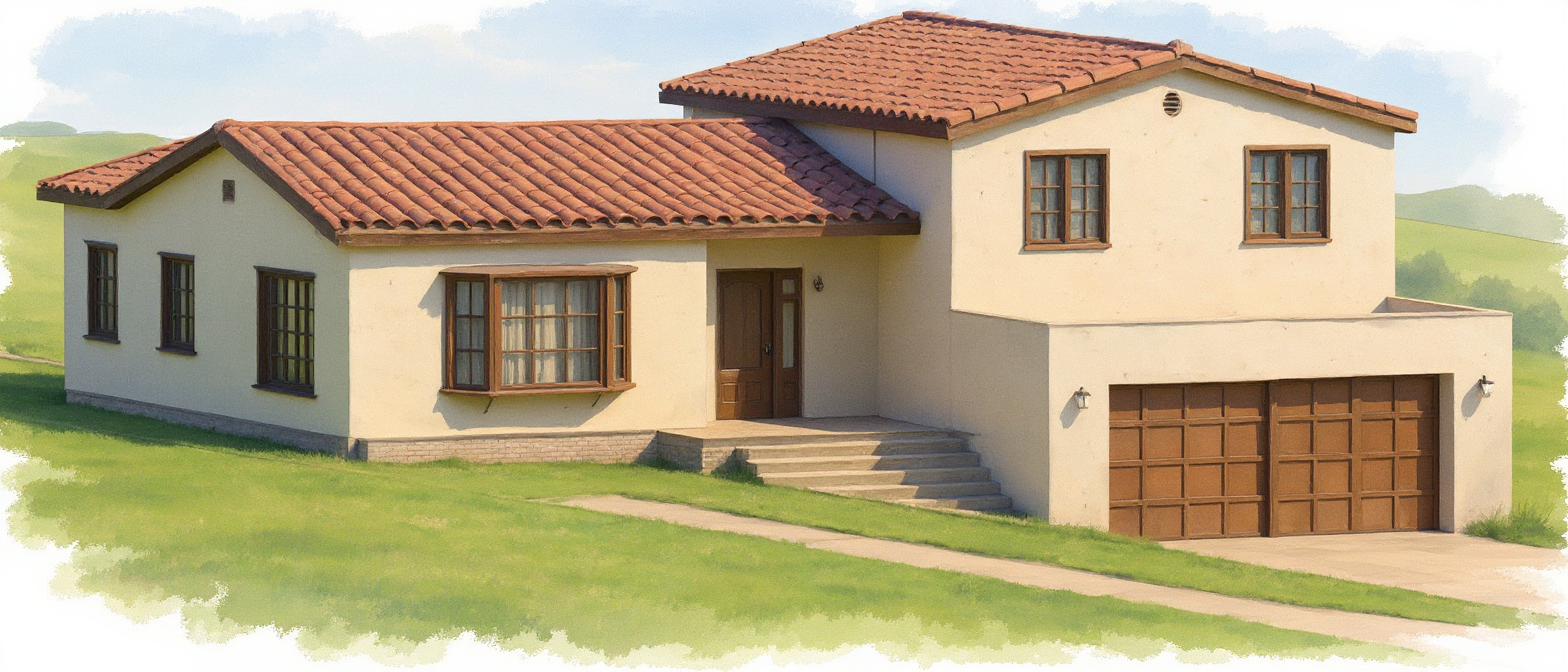 tudor style house half timbering at gables white stucco walls blue windows blue twim brick change rending style to water color sketch