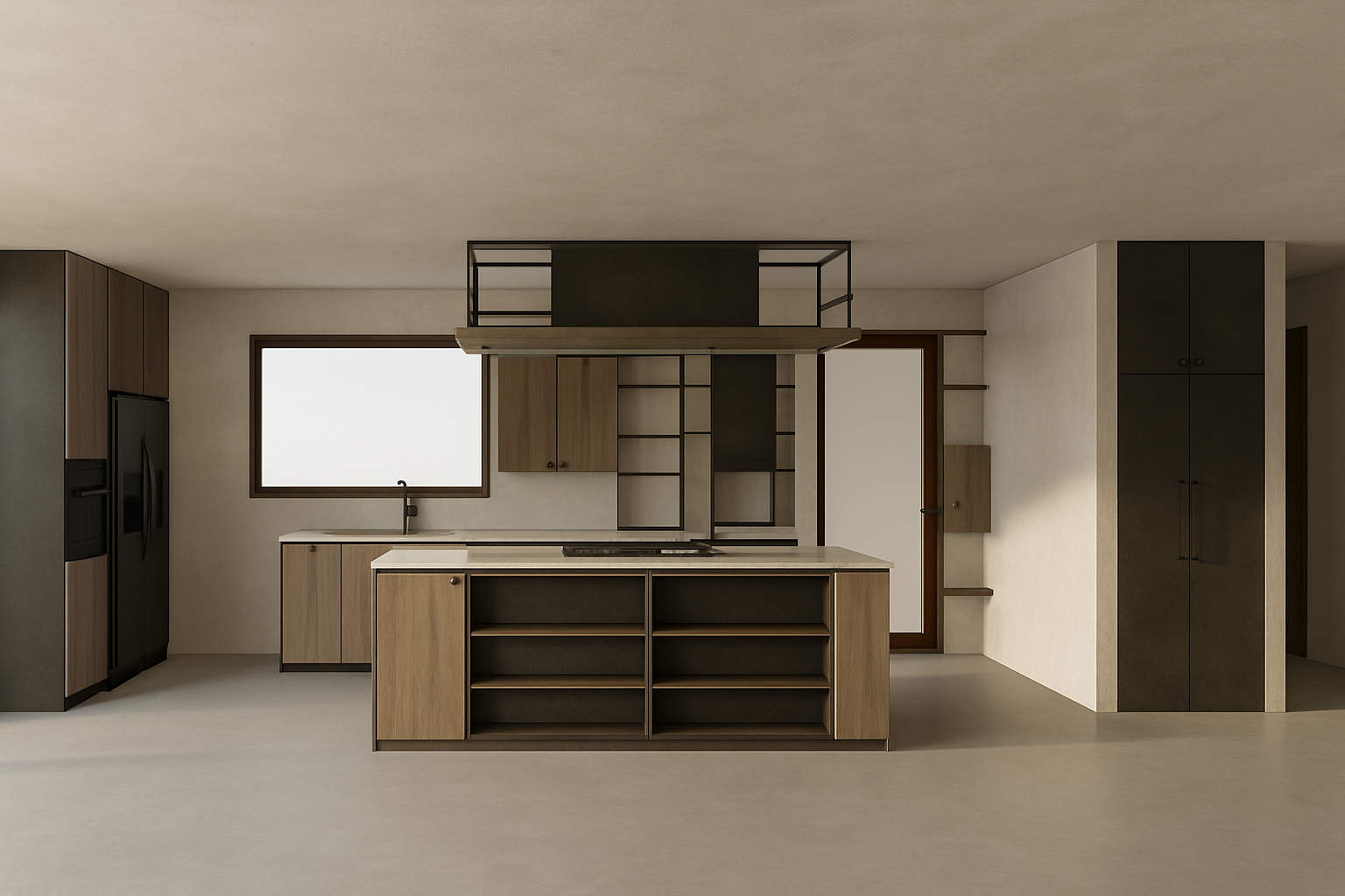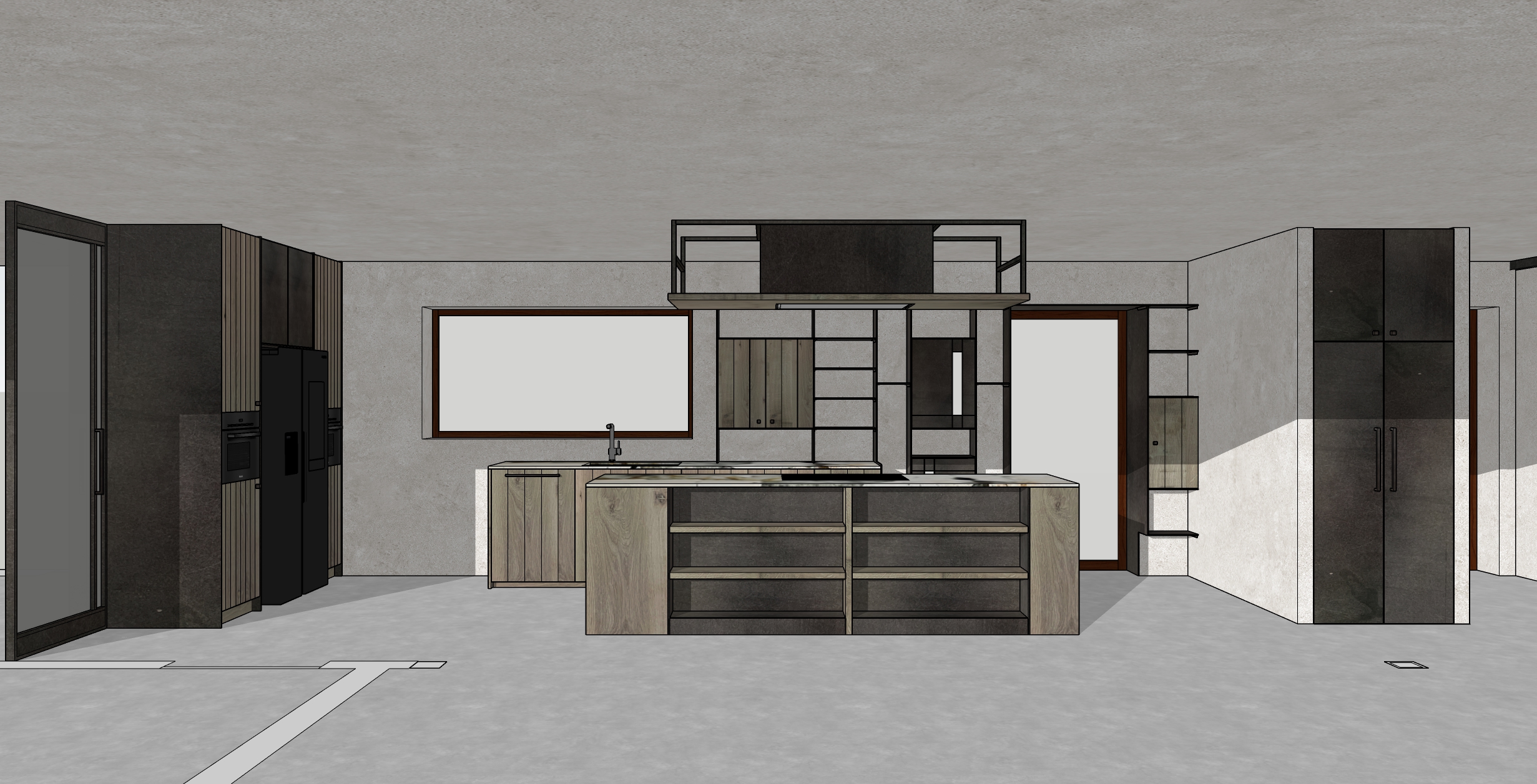 interior shot kitchen with rough wooden planks and a steel finish