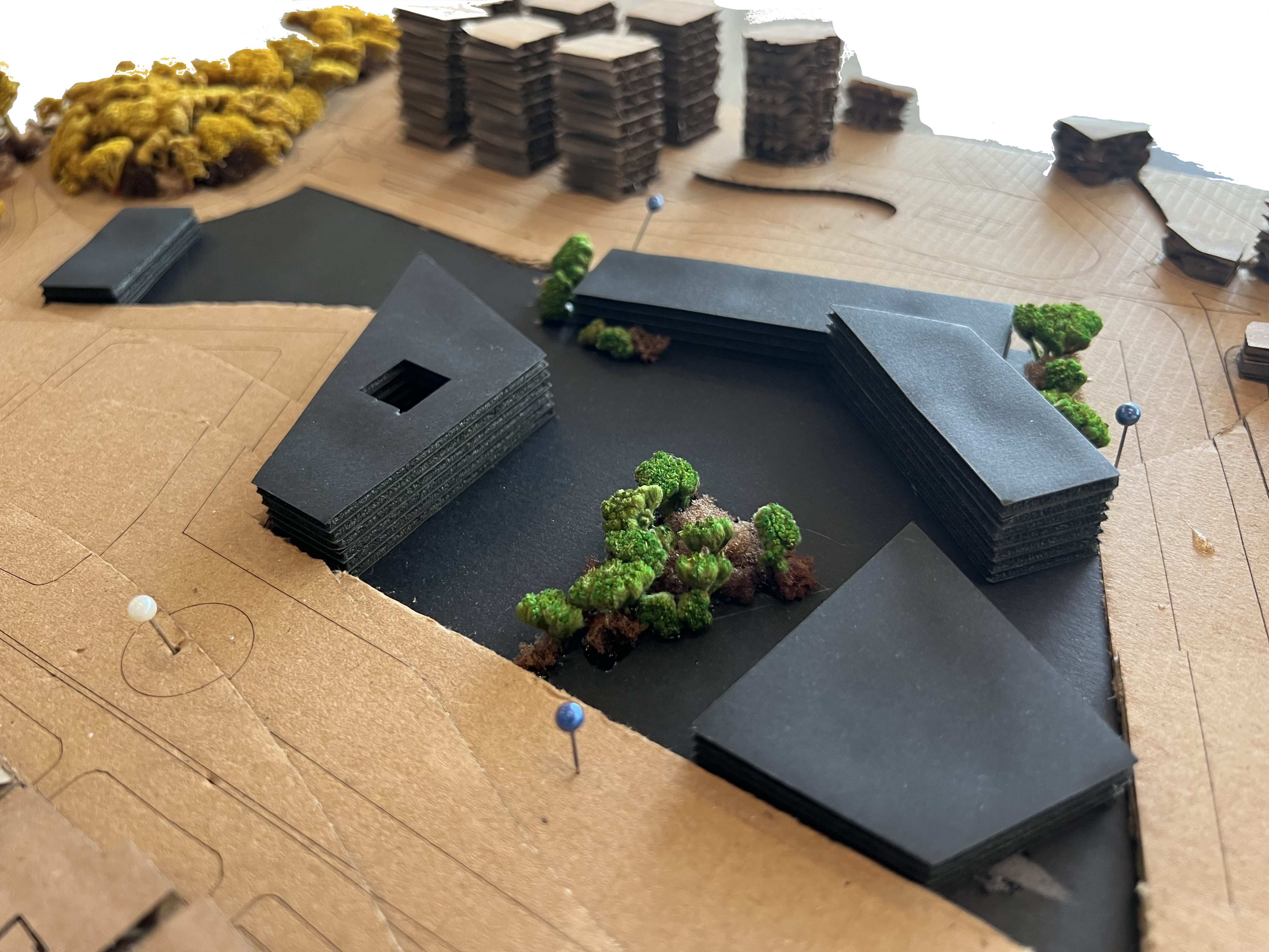 tadao ando exterior shot add landscape on the green ares and the black parts are the building without adding water around and also the long building in the back is higher architecture