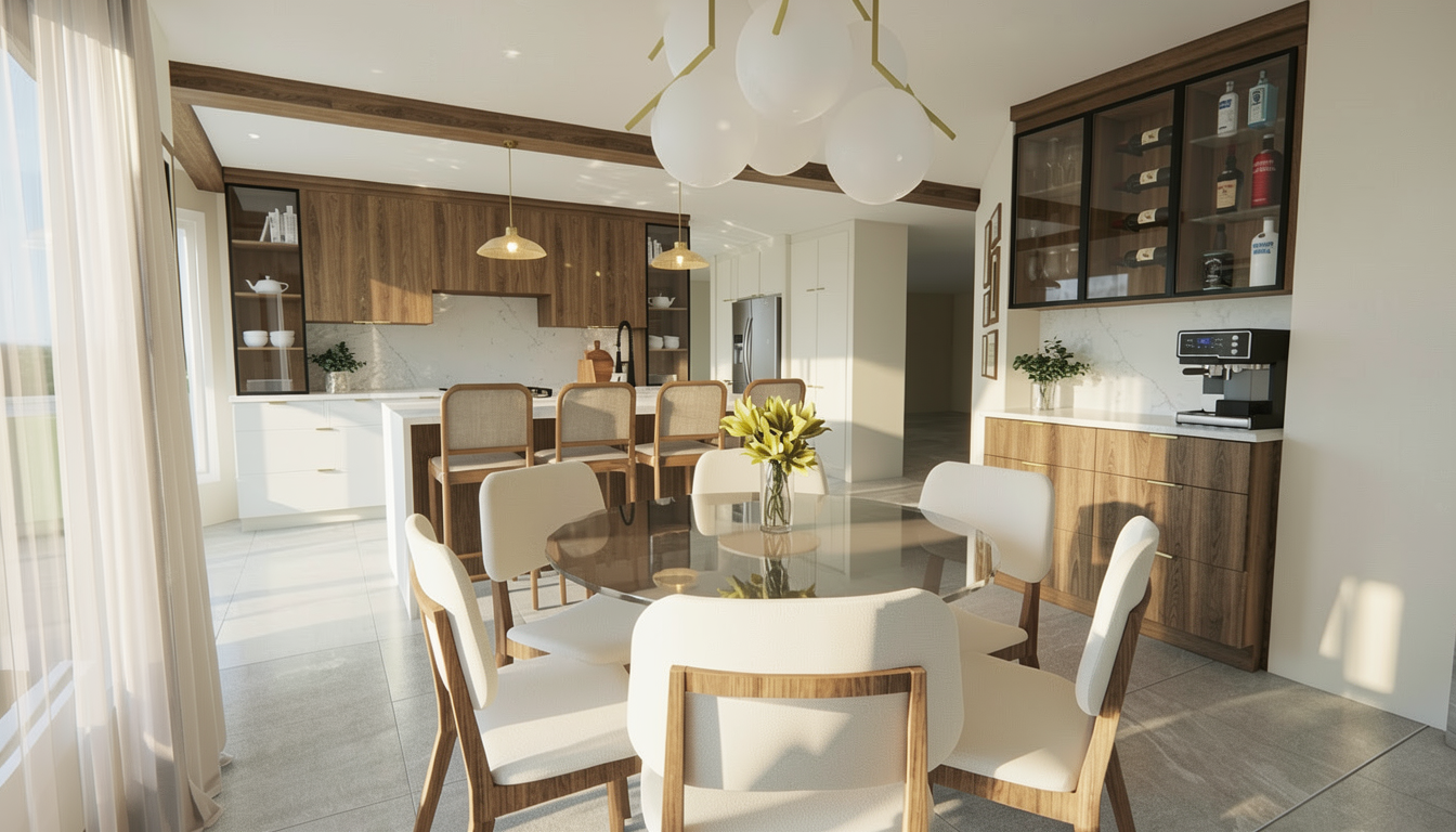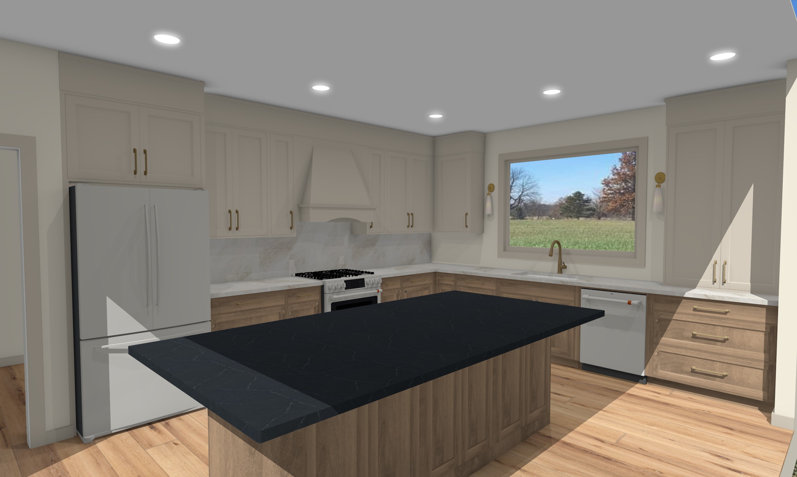 make this image a photograph make the perimeter countertops taj mahal quartzite and make the taj mahal quartzite run up the wall backsplash behind the range wall make the fridge and dishwasher and range stainless steel make the upper cabinets and window casing painted sherwin williams accessible beige
