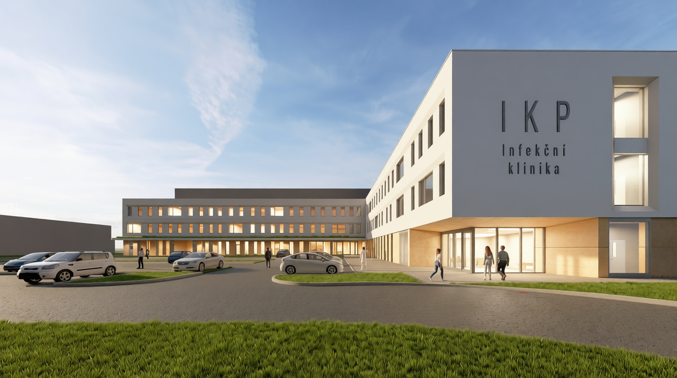 render an architectural scene featuring modern industrial buildings and a parking area the main building has a sleek dark facade with large glass windows complemented by subtle earth tones for the base surrounding the structure are vivid green trees adding natural contrast the adjacent warehouse showcases a light sandy brown with white elements on the roof the parking lot is neatly arranged with cars in shades of blue and silver create a serene early morning atmosphere with soft lighting and a clear sky enhancing the overall harmony and tranquility of the scene