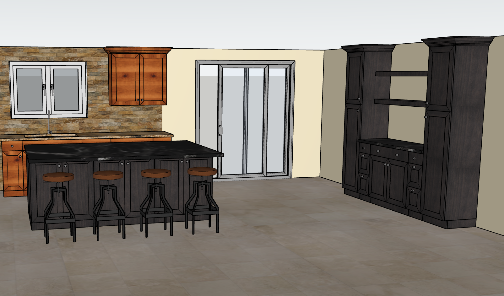 this is a beautiful walkout basement apartment with tons of natural light all the cabinets against the walls are a natural stained knotty alder with a toffee glaze the island and coffee bar on the right wall is a dark stained alder all the knobs are brushed nickel the floors are a off white tile