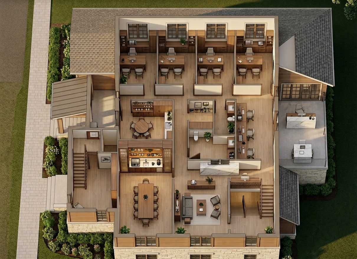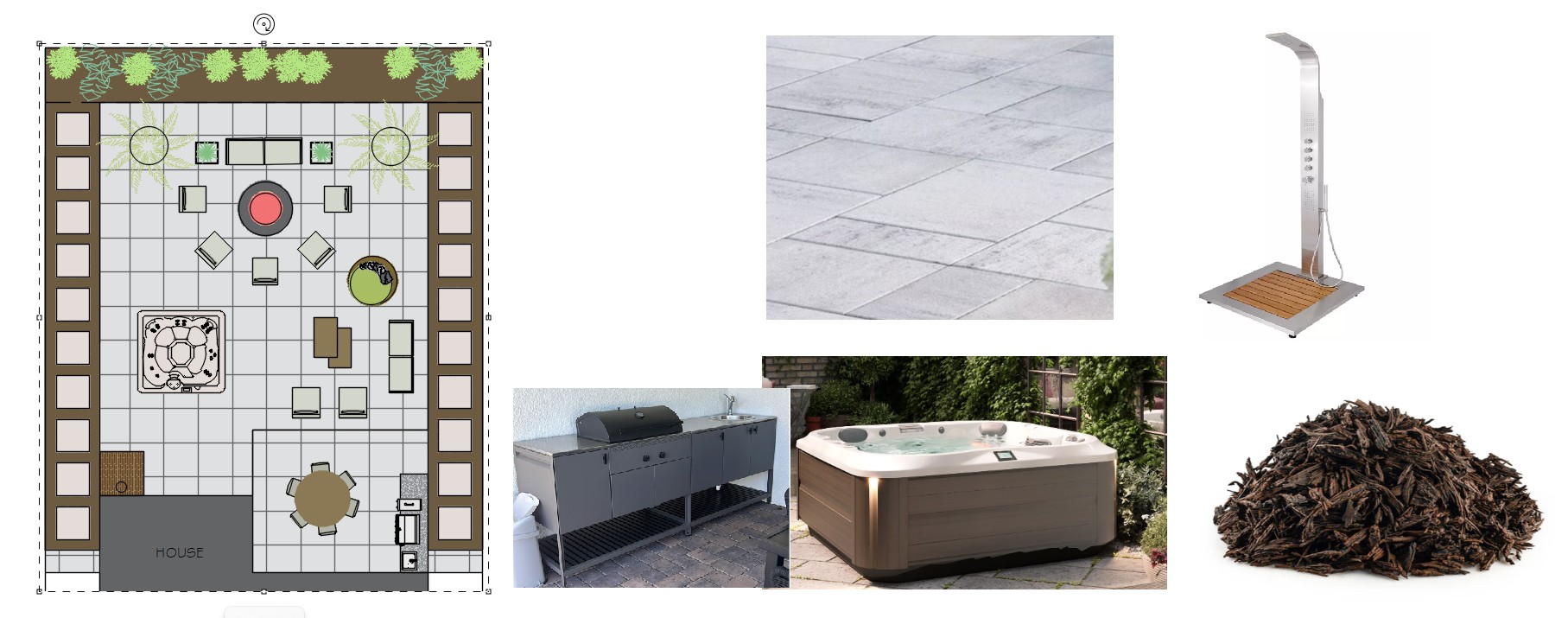 modern zen outdoor floor plan based on provided layout drawing clean architectural top view minimalist exterior design main circulation areas finished with brick pavers in inset pattern side areas featuring steps using the same paver material surrounded by mulch beds for contrast clearly defined functional zones including seating area circulation paths garden and lounge space summer kitchen designed based on reference image spa hot tub included as shown in the reference model integration of natural elements such as stone wood and greenery warm neutral color palette balanced and harmonious composition precise dimensions and scale clean linework with material annotations subtle texture indication contemporary landscape design high detail architectural plan