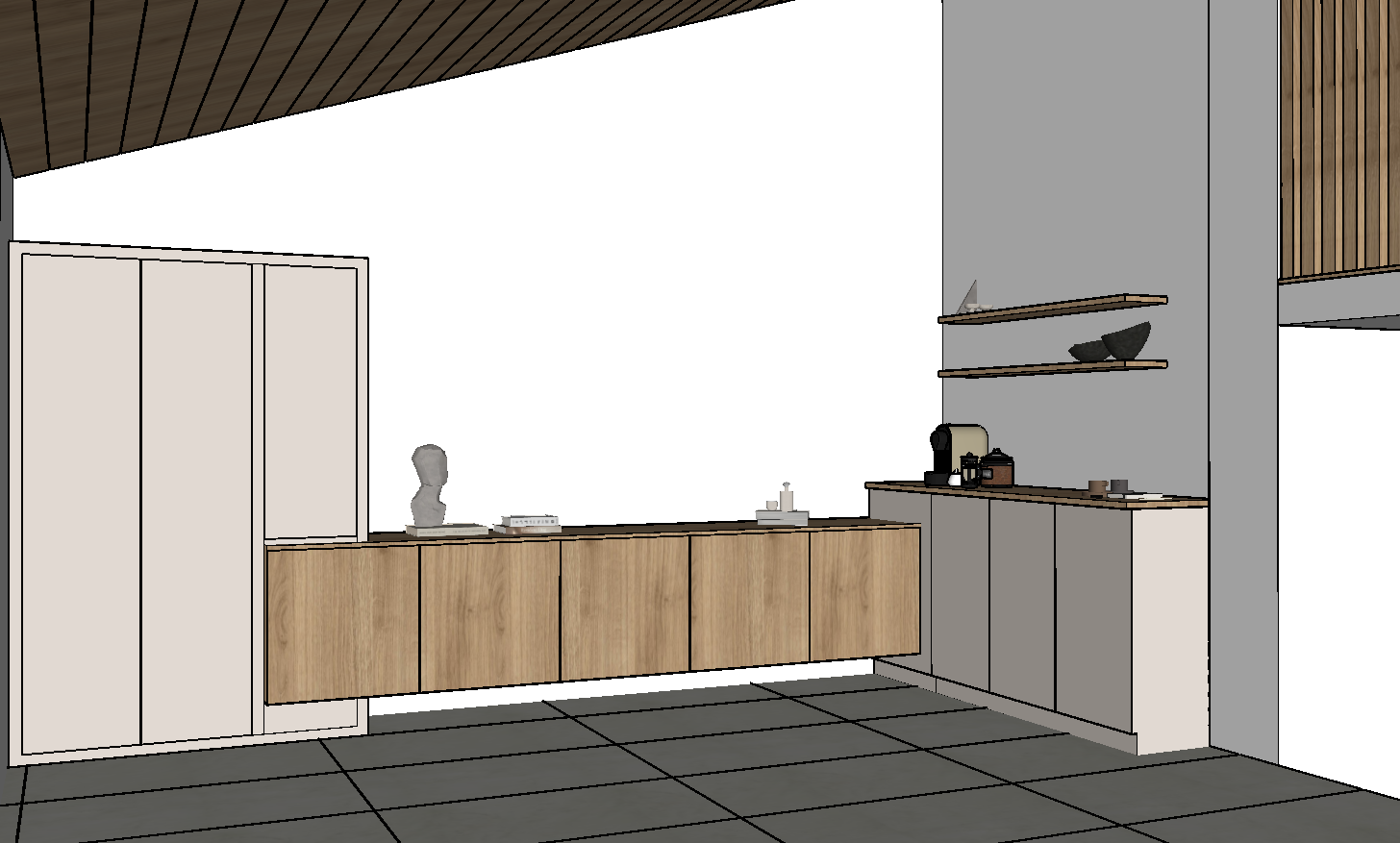 inside the house the floor is made of textured ceramic in white tones the ceiling features wooden panels there is a floor to ceiling cabinet on the wall followed by wall mounted cabinets the cabinets are made of glossy material on the right wall with shelves there are coffee cups on the shelves there is a counter arranged in a kitchenaid style the wall paint in the room is in light mink tones