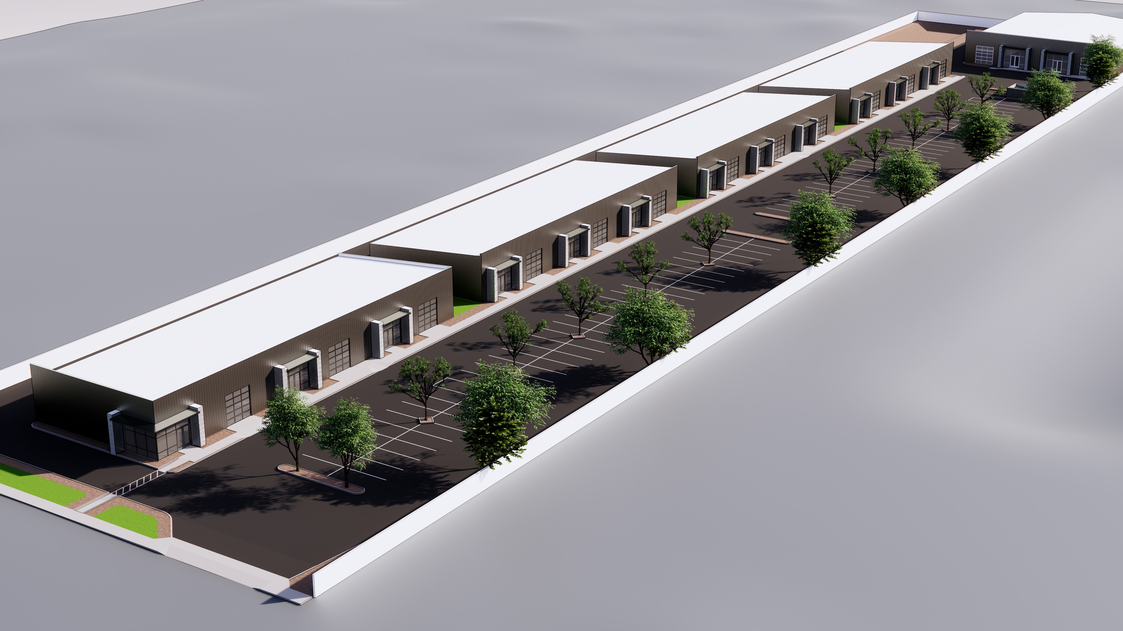 aerial view of new site containing 3 metal buildings with corrugated metal exterior modern storefront windows and doors rollup doors and anodized aluminum overhangs place a few cars in the parking lot and add trees in planters