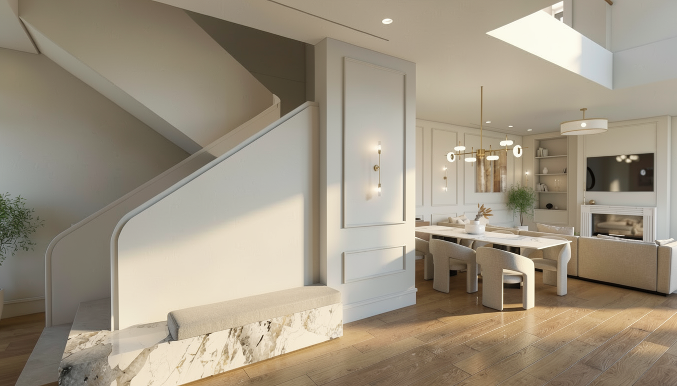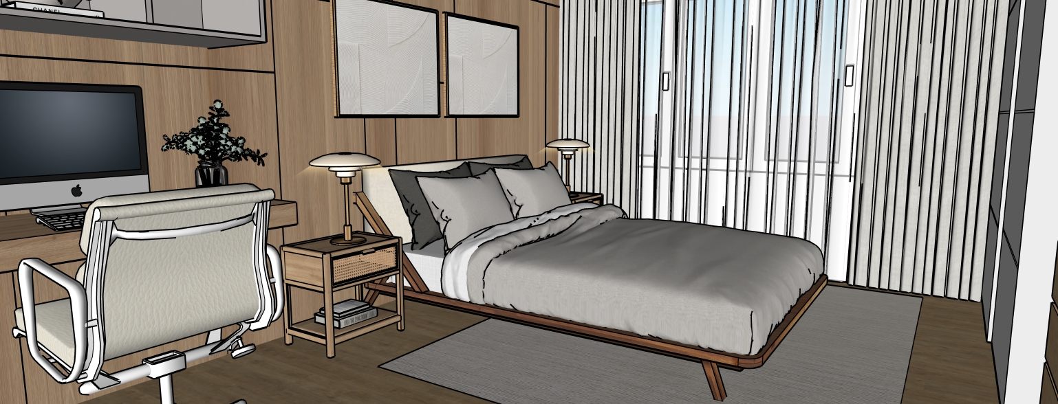 create a beautifully rendered modern bedroom with a cozy elegant atmosphere use warm neutral tones and soft lighting the bed is dressed with plush gray and white bedding walls are light beige adding warmth with a oak wood accent wall to enhance sophistication the desk is a polished wood with a sleek black computer complementing the modern white office chair shelves are white with subtle decor and books are vibrant to add color add a soft glow from a stylish desk lamp and a modern ceiling fixture the floor is rich light wood contributing to a tranquil environment enhance with soft shadows and natural lighting for a serene ambiance