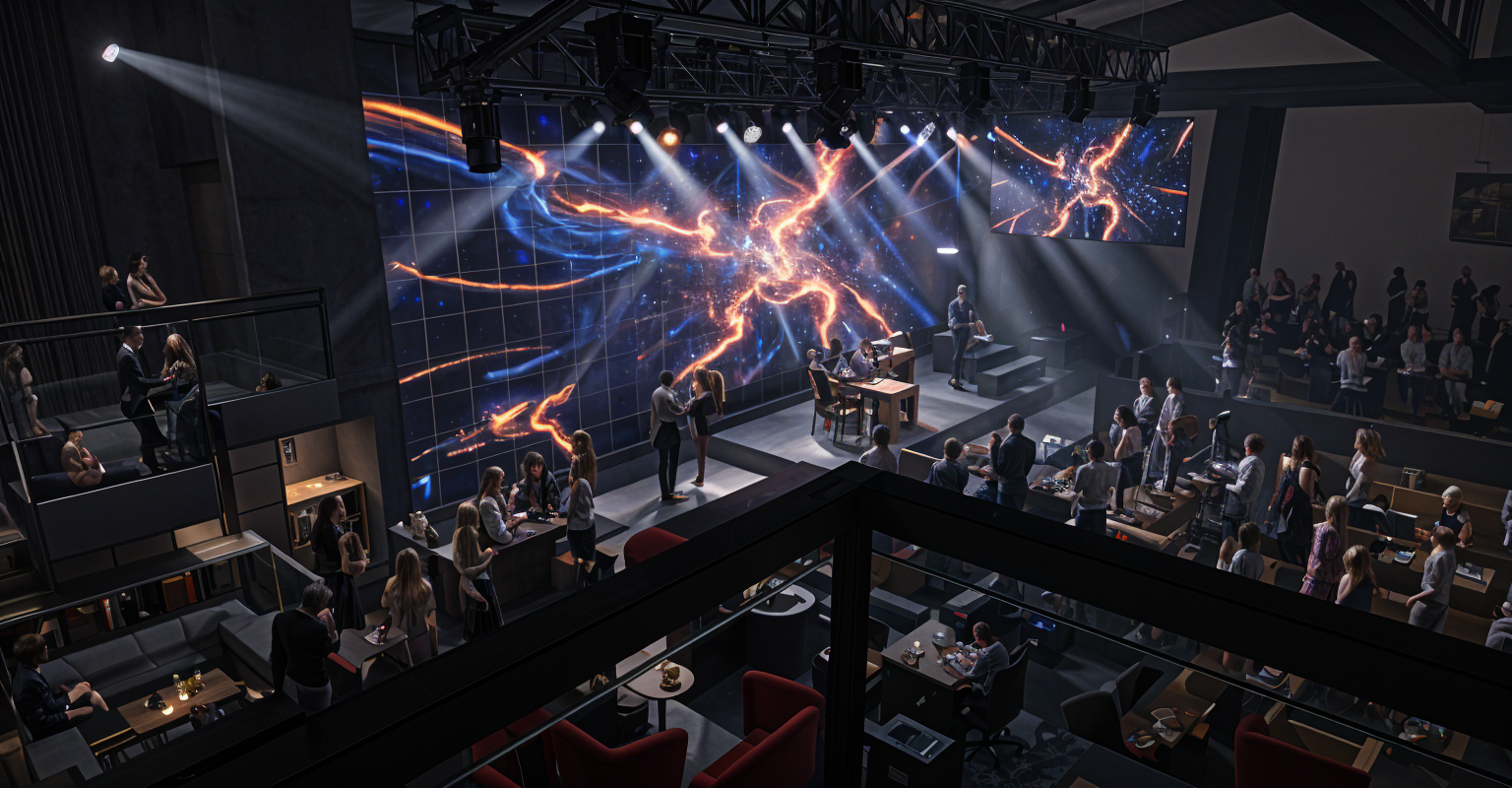 high tech perspective shot keep the exact camera angle distance and perspective from the supplied image do not move the camera or change focal length convert this scene into a photoreal upscale nightclub at night preserve the architecture exposed steel trusses balcony railings ceiling height stage shape wood fascia rigging positions and the single led wall do not change the geometry the audience area in front of the stage is a sunken dance floor that sits lower than the surrounding level the perimeter walkways and lounge platforms around it are higher preserve this elevation change do not flatten the floor levels add dramatic stage lighting with visible beams and subtle haze originating from the existing fixtures on the truss the single led wall should be slightly dimmer than the stage lighting display one unified abstract motion background clean and consistent no collage no text no logos no photos add a rectangular picture in picture imag overlay inside the led wall content as if routed through a switcher the led wall is the only screen do not add any other displays add upscale lounge seating with premium materials like leather velvet brushed metal and dark wood around the higher perimeter areas increase patron density patrons should face the stage and pay attention to the performers use polished concrete flooring with soft reflections lighting is warm and architectural mood is modern exclusive energetic concert ready architecture