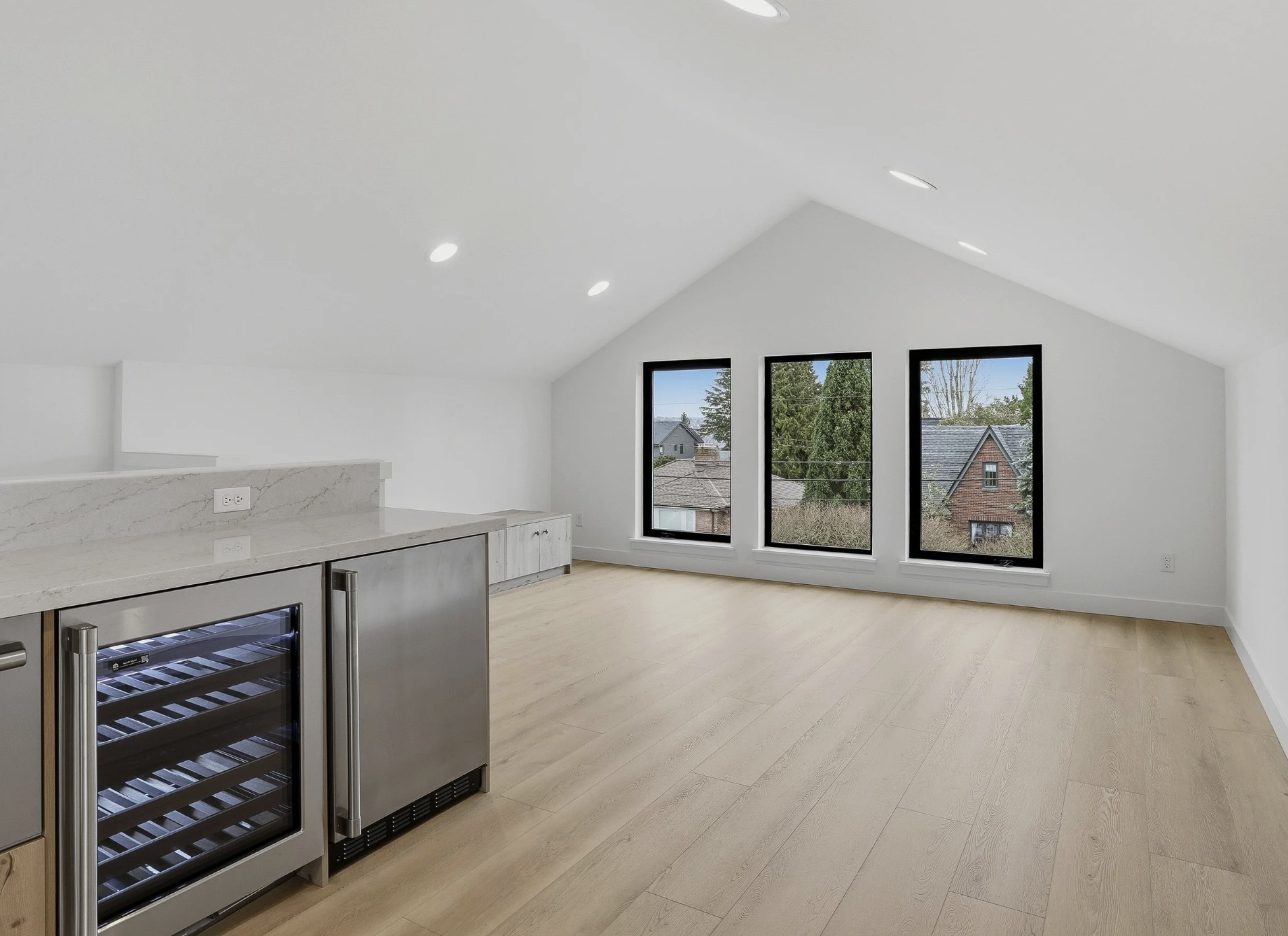 leave in the bar counter and fridge but add a couch tv coffee table and make it look fun