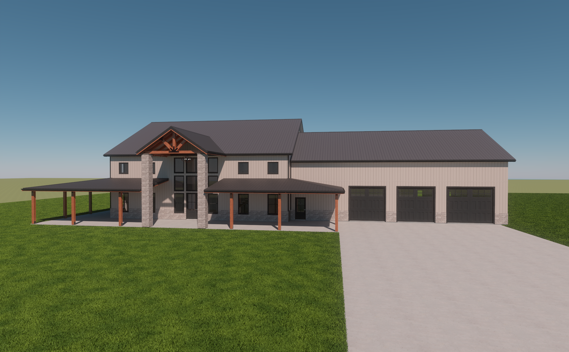 retain the colors enhance the stone and build to make it look more realistic maintain the vertical siding make the grass look realistic give me a rolling meadow background with green trees architecture