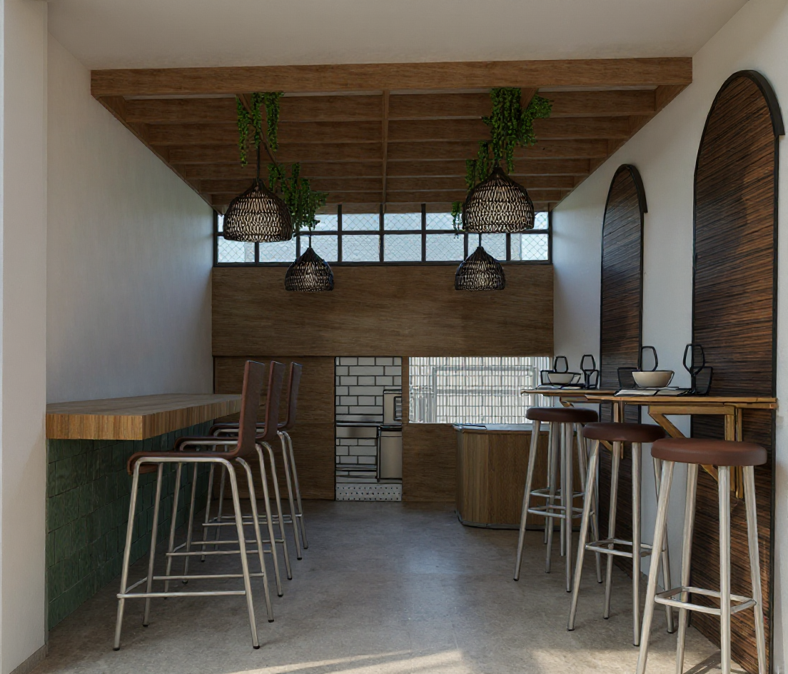 do not change the building do not change the materials make the mood vibe environment the same as the reference images add more texture and sharpness to materials add polished concrete floor the triangle behind the back window should be grass with scrubs the sun is shining through the right hand side of the imagine