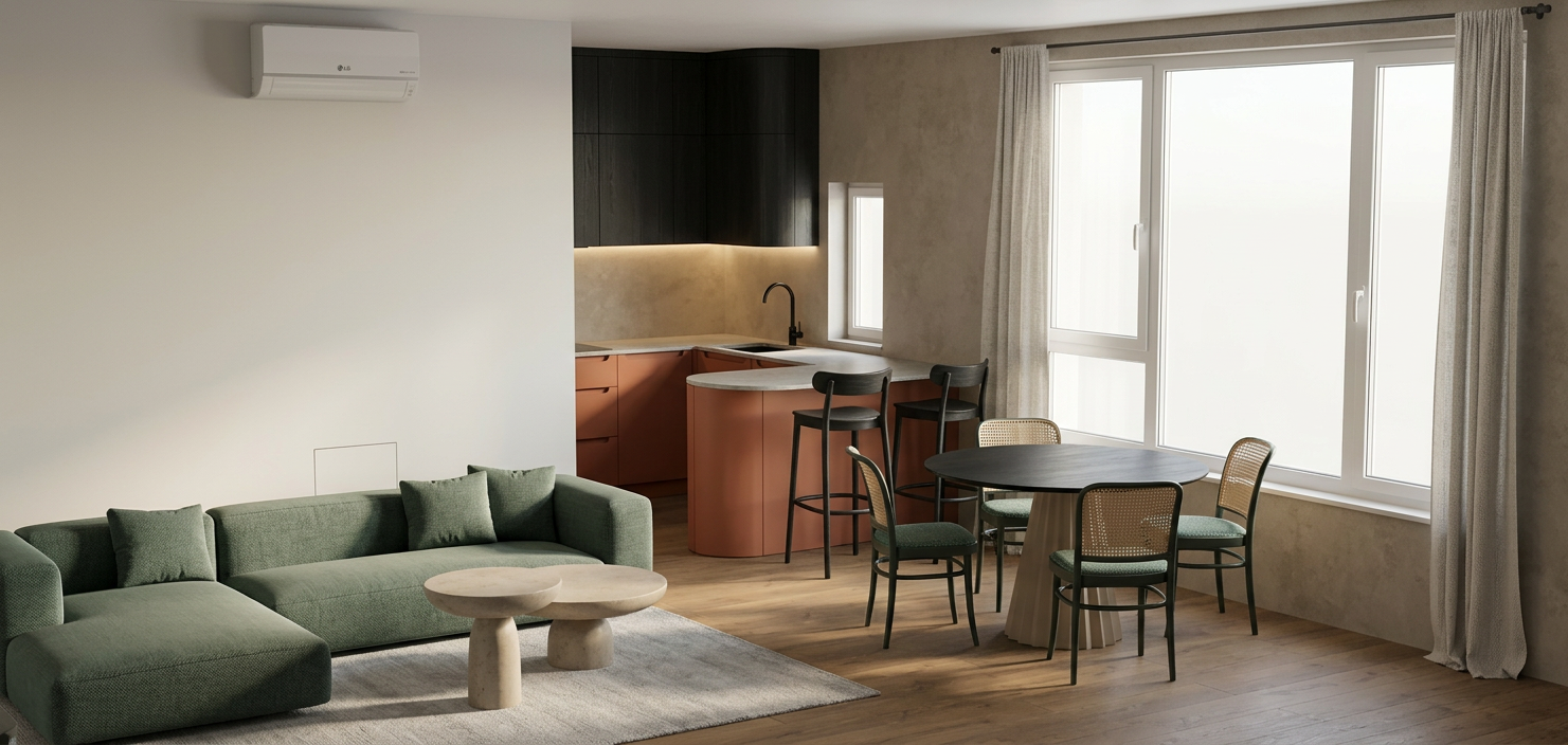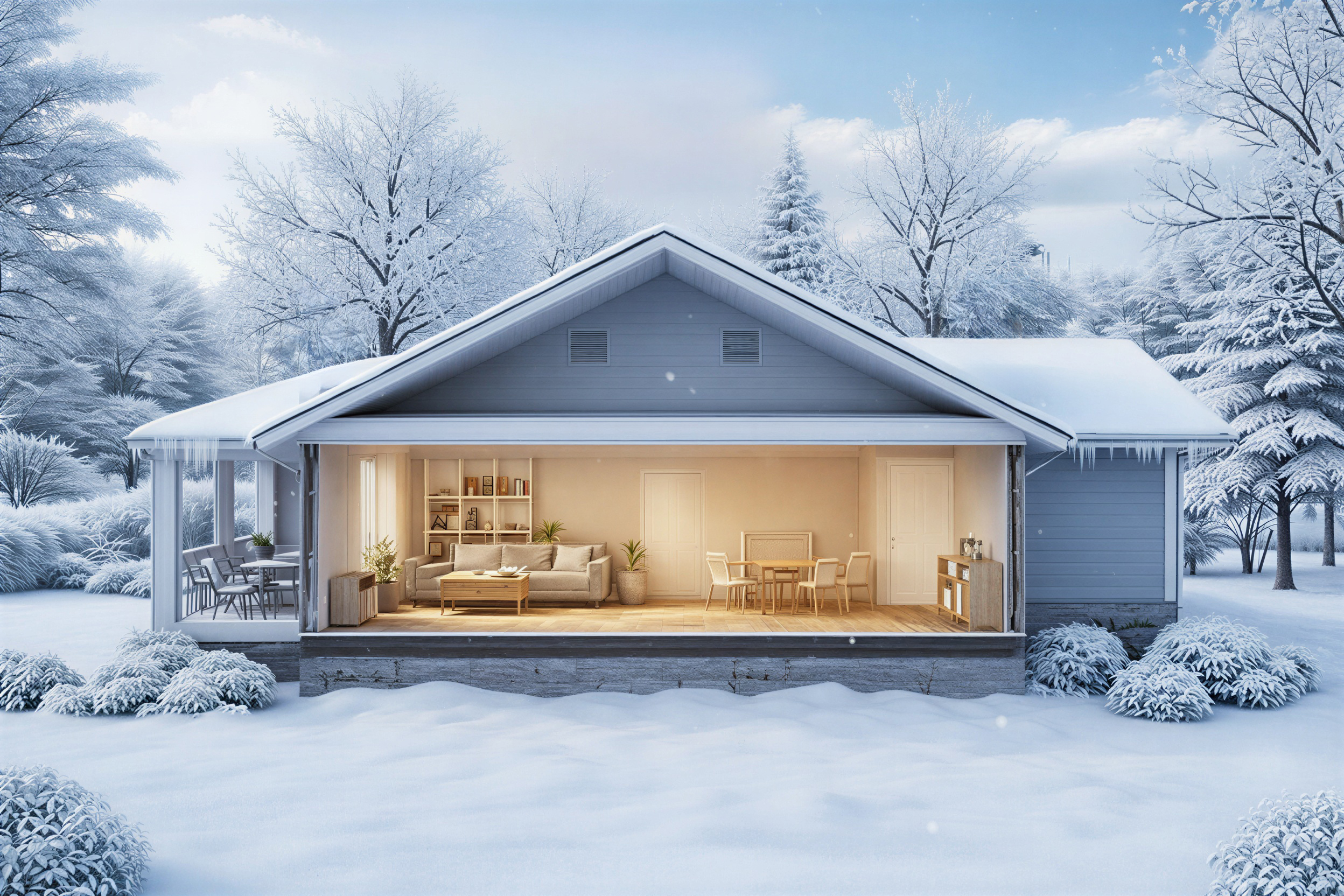 architectural cross section cutaway illustration of a single story residential home in summer setting the house is shown from the front with the facade cut away to reveal the interior the house has a low wide profile with a single pitched roof identical structure to a one story bungalow exterior lush green landscape full leafy trees and manicured shrubs in vibrant green bright clear blue sky with soft white clouds warm golden sunlight gray blue siding on the house exterior attached garage visible on the right side with a dark roof snow free frost free ice free environment dense green shrubs and bushes lining the base of the house on both sides a generous lush green front lawn stretches out toward the viewer main floor ground level open concept living and dining area living room with a beige gray sofa wooden coffee table and potted plants dining area with wooden chairs and table warm wood flooring throughout bright warm natural lighting filling the space bookshelf and storage cabinetry along the walls covered patio porch visible on the left side with outdoor seating the single floor sits directly at grade level with green grass and shrubs meeting the base of the house seamlessly photorealistic rendering style clean modern interior design bright warm natural summer lighting throughout single story only no upper floor no basement no void beneath the house no snow no ice no icicles no text labels no arrows no annotations