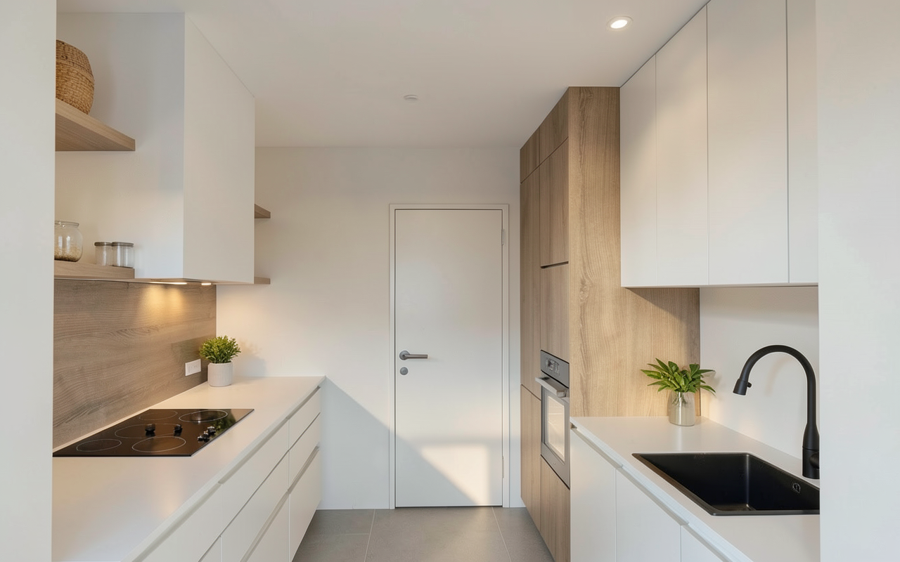 modern wood accent wall on the right light blue paint on the walls colorful floor mats kids toys on shelves montessori ladder shelves with books and toys doll house on the floor recessed ceiling lights white baseboard florida setting outside the window blinds on window 5 panel frosted glass door return and supply diffuser in ceiling