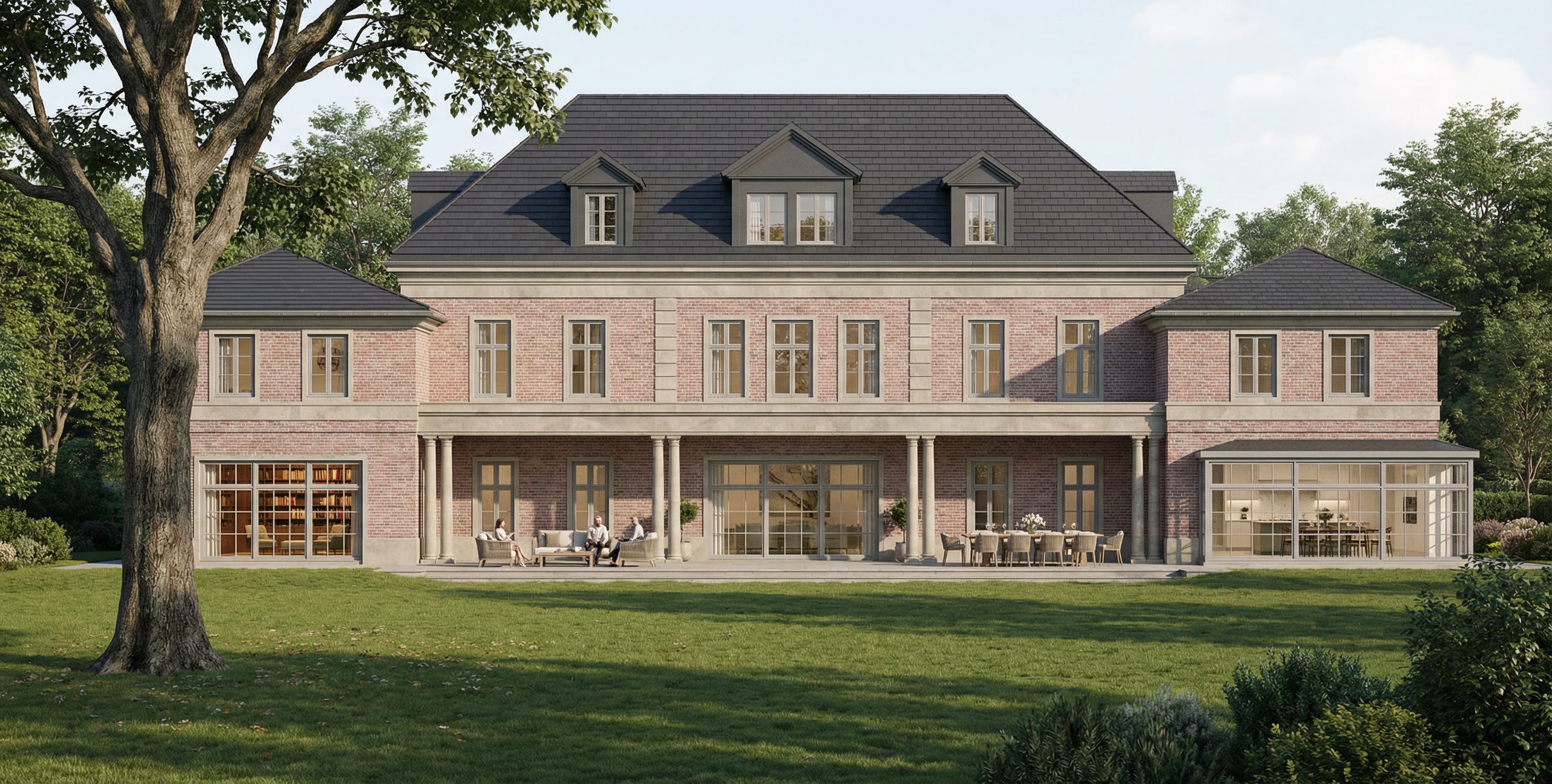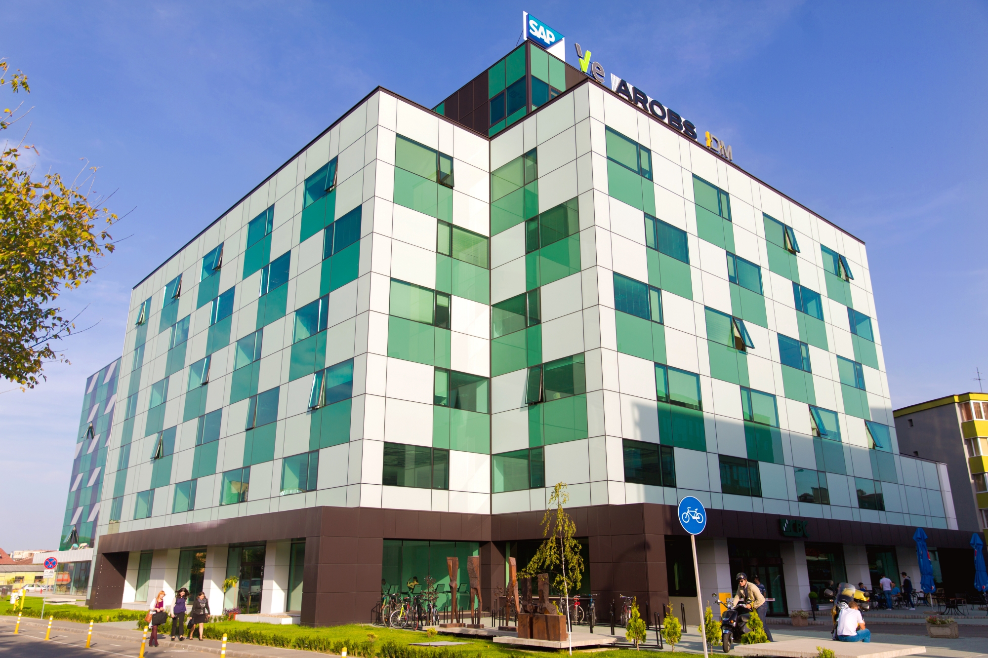 important preserve the existing geometry and the existing context exactly as provided do not modify alter reinterpret add remove scale or reshape any geometry do not change the site surroundings street layout neighboring buildings vegetation or context elements do not modify geometry scale proportions buildings road layout sidewalks or surrounding context in any way do not modify text soft late afternoon natural daylight neutral and diffused sunlight coming from the top subtle shadows realistic global illumination slightly hazy summer atmosphere soft ambient subtle sky reflections in windows slightly reflective glazing with realistic fresnel effect soft motion blur on people for realism light breeze feeling in vegetation natural green tones sunlit tree leaves casting soft dappled shadows photorealistic exterior visualization balanced exposure no harsh highlights no overblown whites slightly warm white balance realistic asphalt reflections with mild roughness physically accurate light behavior high dynamic range but controlled