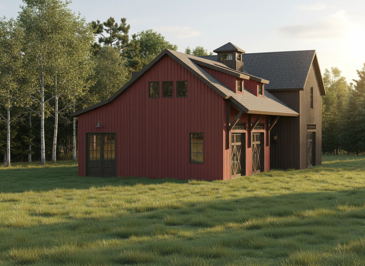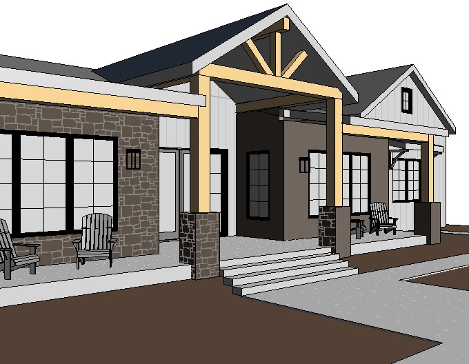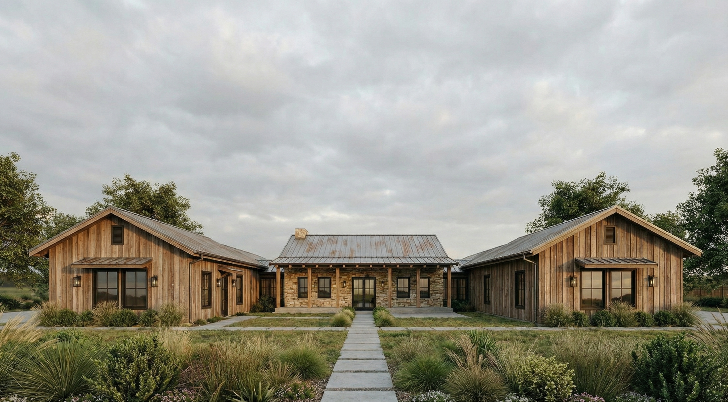 a modern farmhouse with black windows stacked limeston stained cedar accents charcoal gray vertical siding black standing seam metal accents dark gray asphalt shingle roofing layered california native planting