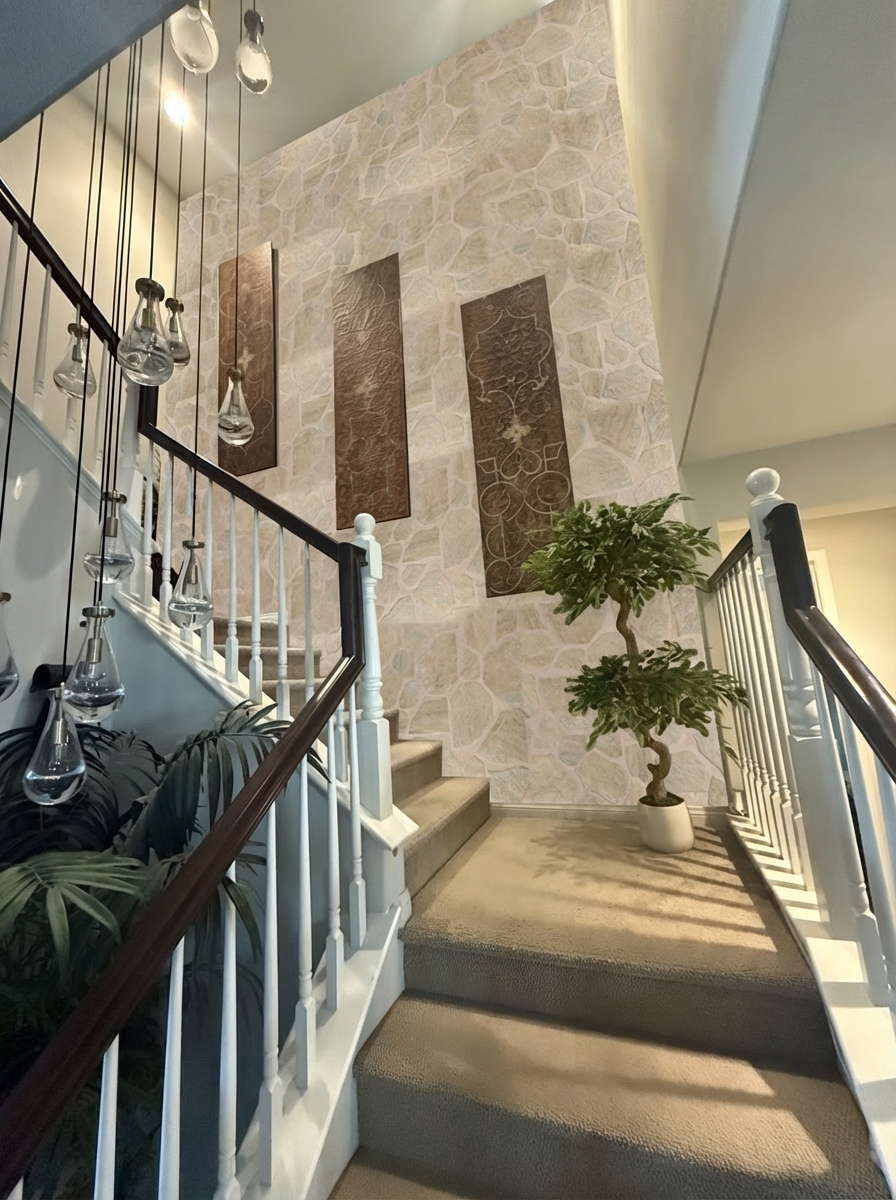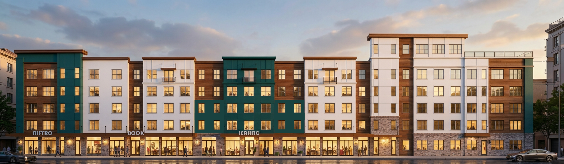 add 3 palmetto trees to the rooftop deck on the top right of the building directly behind the railing add some small landscaping in front of the building and in parking lot