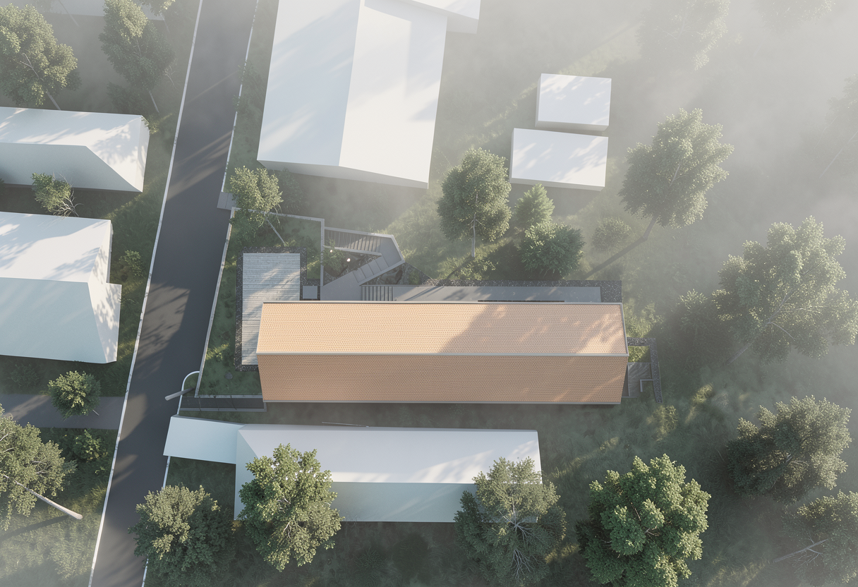 create a photorealistic architectural visualization of the provided scene from an elevated aerial viewpoint preserve all original materials colors lighting fog and the overall atmosphere of the scene exactly as they are geometry lock the original geometry proportions dimensions and spatial layout of the entire model must remain completely unchanged do not modify deform simplify smooth rebuild or redesign any architectural elements including stairs roofs walls openings or details enhance the composition by adding realistic trees distributed naturally across the scene including the foreground midground and background not only in the front trees should be well scaled and integrated without altering the original design intent or geometry maintain high material accuracy realistic light behavior in fog soft shadows and a professional architectural visualization style do not change the mood weather conditions or environmental atmosphere of the scene