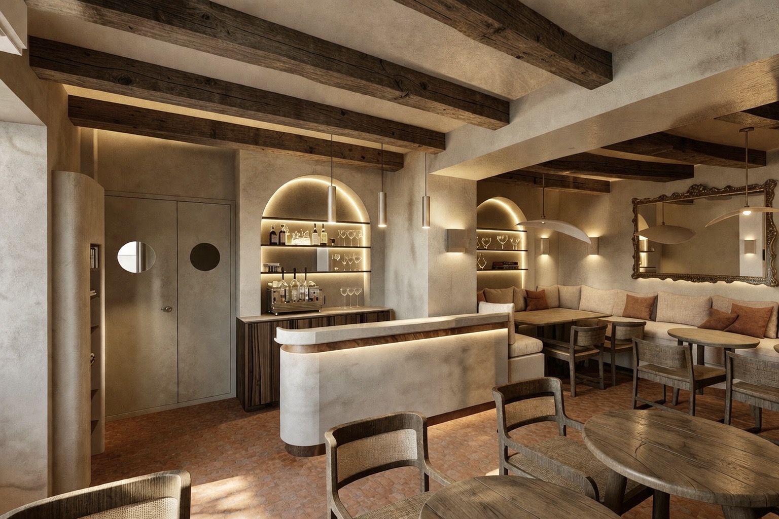 work on the lighting led following the arches behind the bar and behind the bench also work on enhancing golden lighting wabi sabi style make the wood beams more realistic texture wise make the concrete beige walls and bar look more realistic make the benches and cushions have more obvious linen volume and more realistic texture bump and do the same for cushions the tomette also very realistic on the floor make the mirror more old and collector and charming then how it looks now give the bench texture fabric a nice beige authentic linen look and same for the very pastel terracotta linen cushions put some bottles behind the bar on the shelves and some nice cocktail glasses put books wabi sabi style on shelves and for the kitchen doors smooth concrete finish with behing the two glass rounds some walls and golden lighting just to say there is a kitchen scenery back there