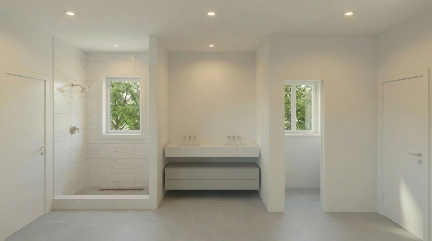 keep everything exactly the same in the rendering do not change the layout walls windows doors vanity fixtures shower walls or main floor tile only modify the window to the left in the shower make it half the size in length but keep where it starts keep everything else the same