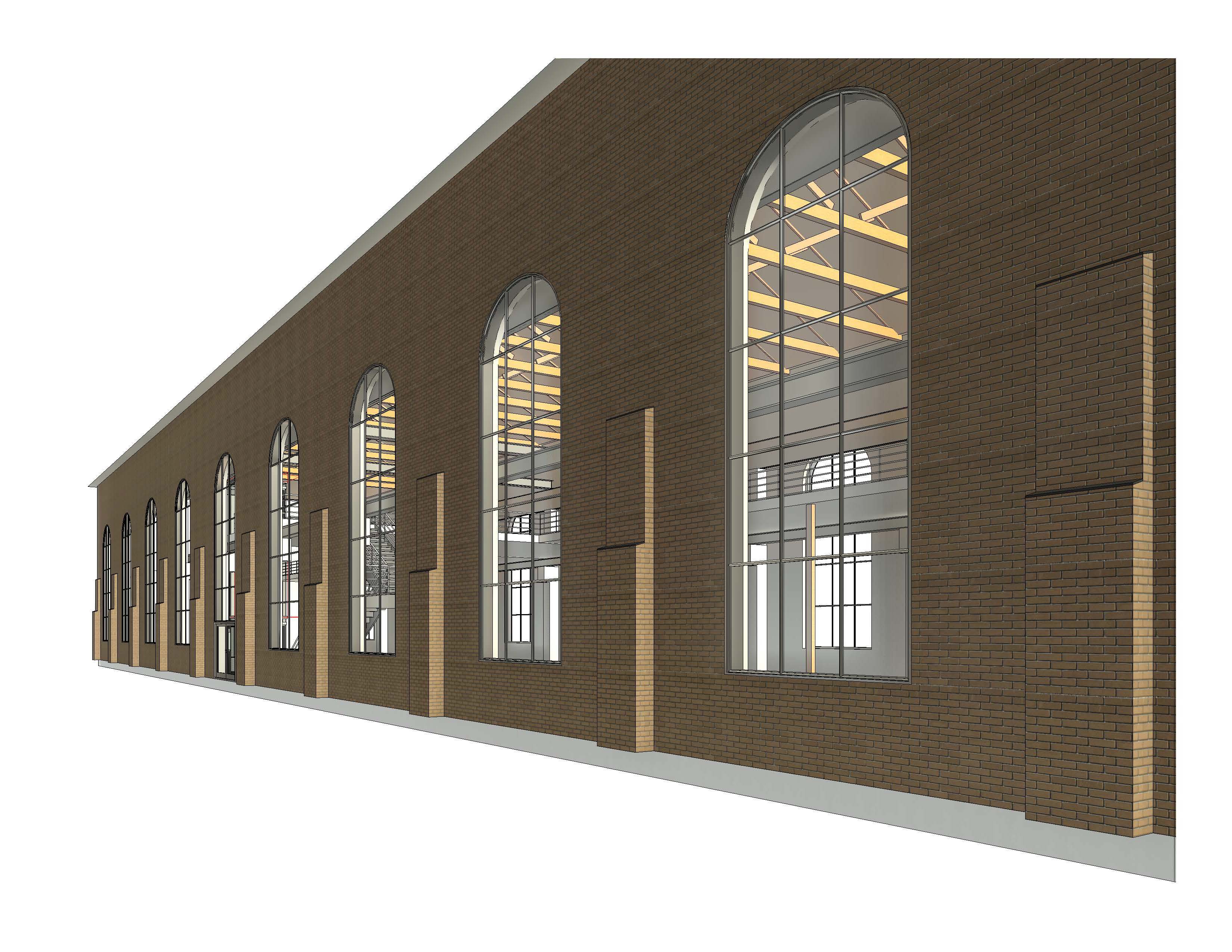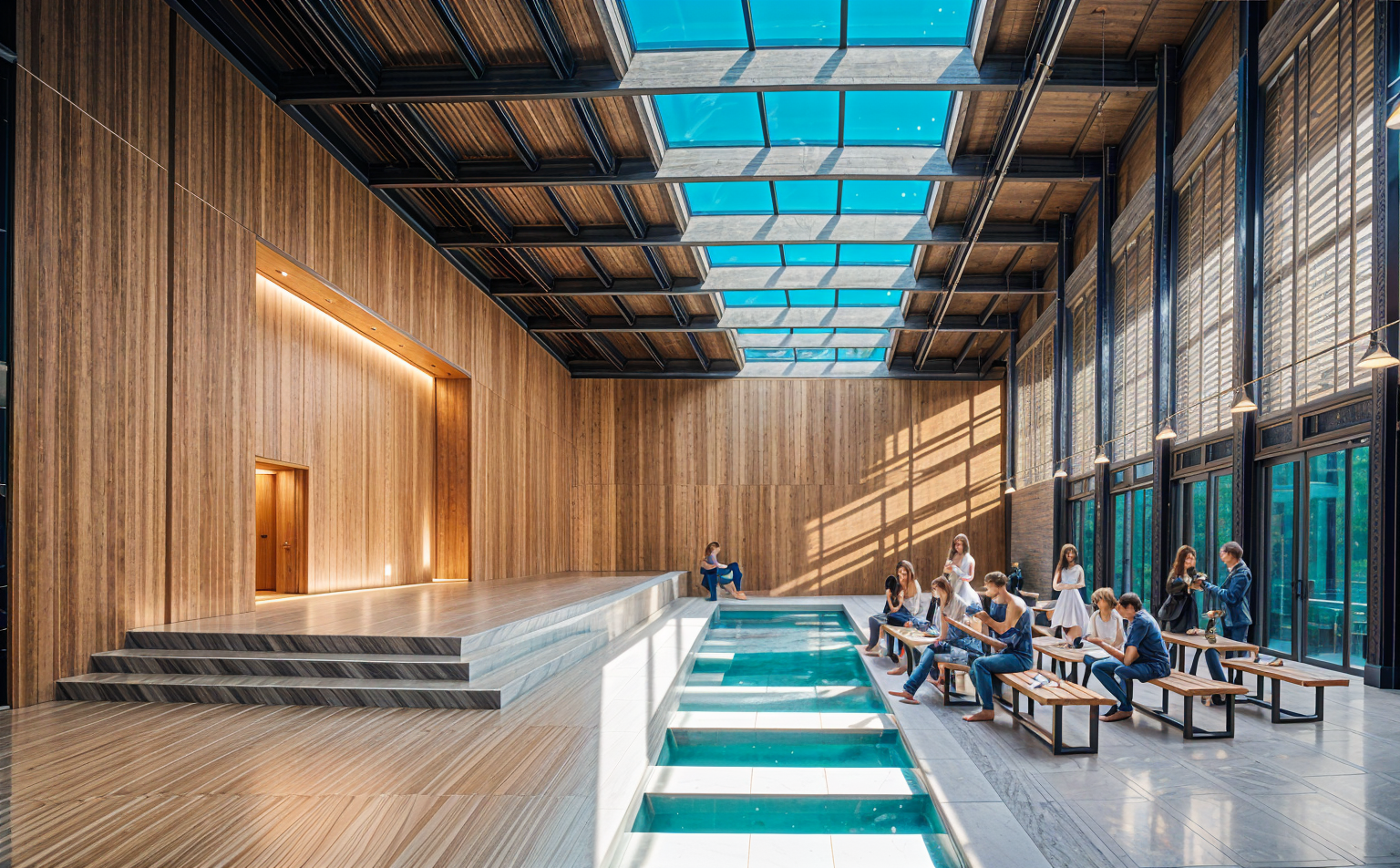 dont change the orginal building only change enviorment around the building warm summerday make a realistic background in a city industrial area place tabels and plants in front architecture