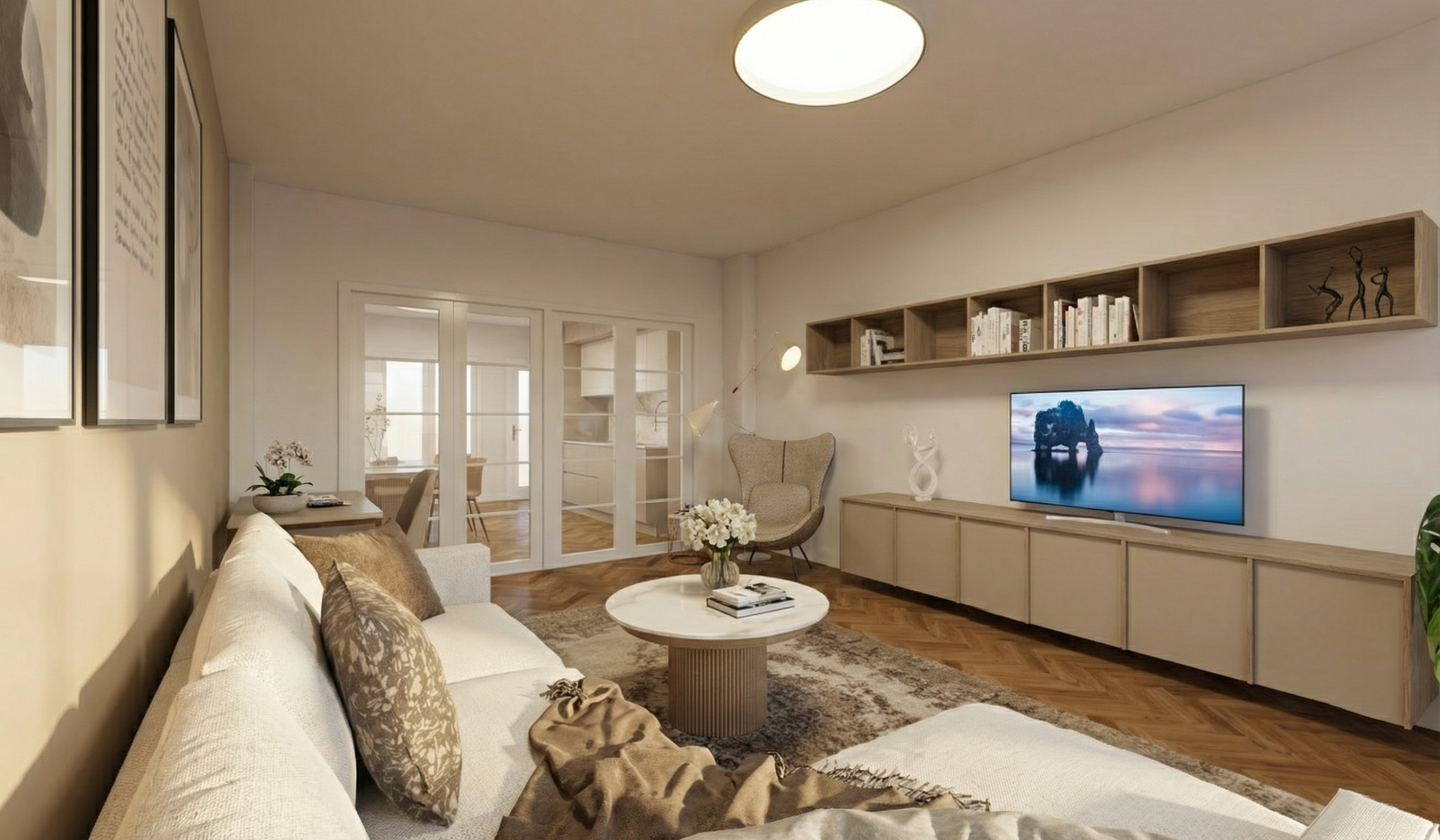 ultra photorealistic modern living room interior keep the exact architecture window positions and room proportions unchanged ceiling in clean matte white finish light warm toned wooden parquet flooring furnish the space in a very modern contemporary style rounded soft shaped designer sofa organic shaped coffee table curved lounge chair minimalist low tv unit furniture with soft rounded edges no sharp or boxy shapes neutral elegant color palette with warm tones lighting modern designer floor or pendant lamp with soft shapes subtle recessed ceiling lights warm indirect ambient lighting no curtains no drapes no window coverings large windows remain open and unobstructed clean elegant high end residential atmosphere professional architectural interior photography style no cgi look no artistic or stylized rendering