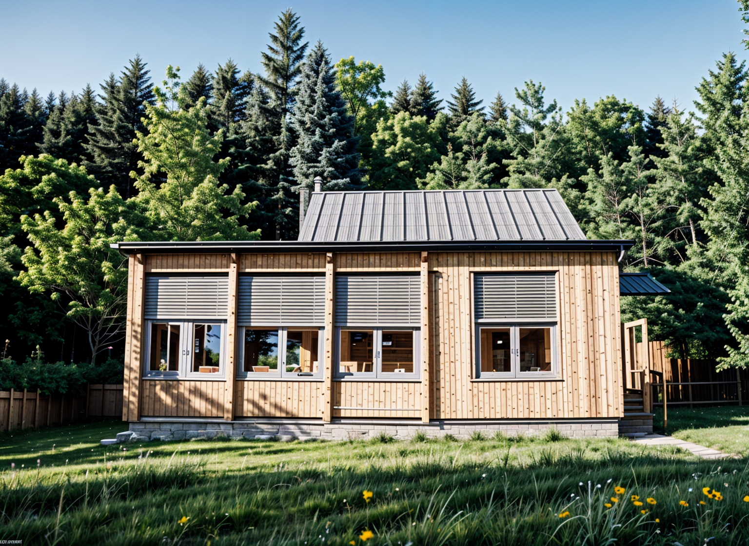 create a photorealistic rendering of this design an ultra photorealistic architectural visualization bathed in warm soft golden hour sunlight maintain the building s volumes the facade is made of light gray bricks and natural wood panels the roofs are anthracite colored flat tiles focus on realistic textures add natural elements such as meticulously detailed green foliage blooming flowers and a perfectly manicured lawn emphasize realistic shadows and highlights creating depth and dimension the overall atmosphere should be tranquil elegant and inviting
