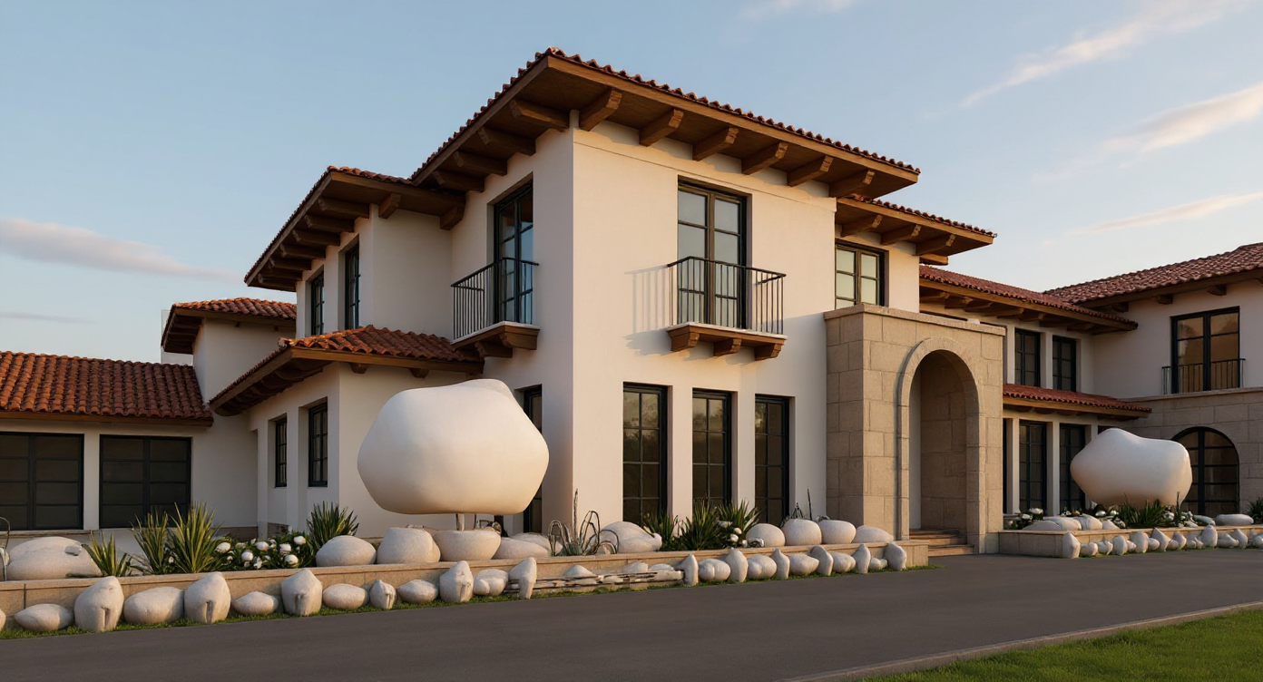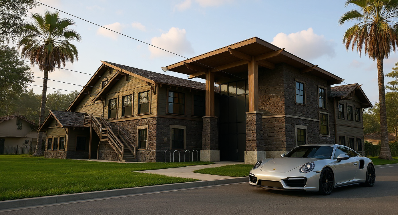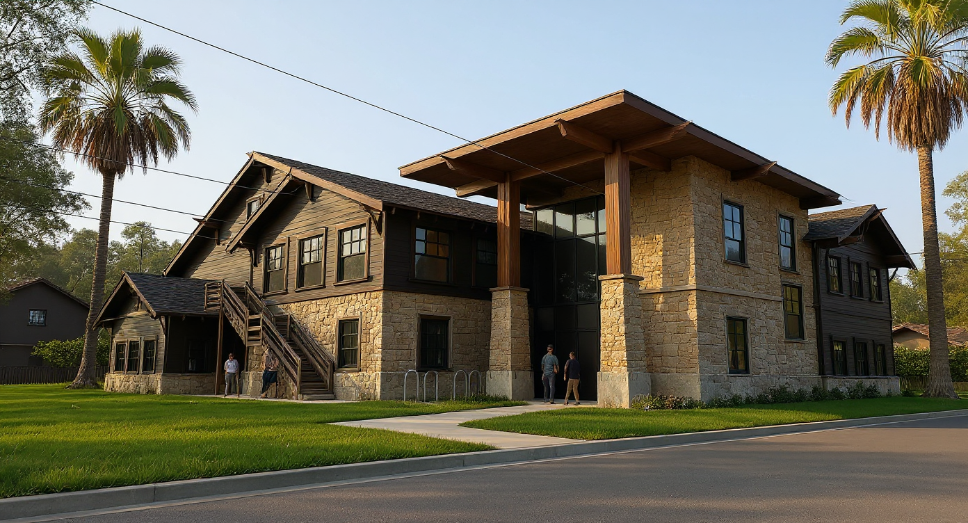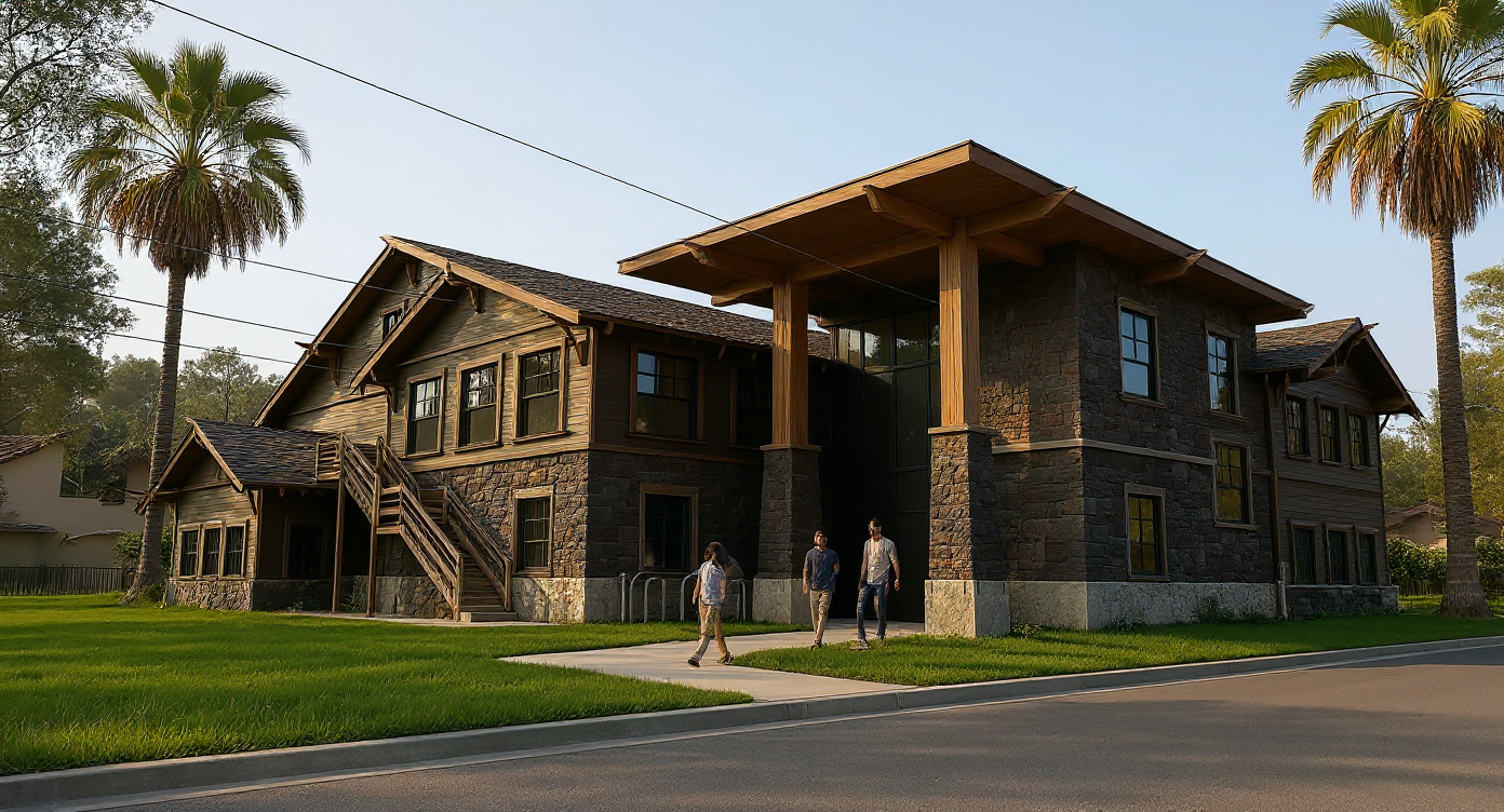 create realistic photo darker brand new clean building with stone and cedar wood siding add california native landscape and trees bright sunny california high noon weather remove car