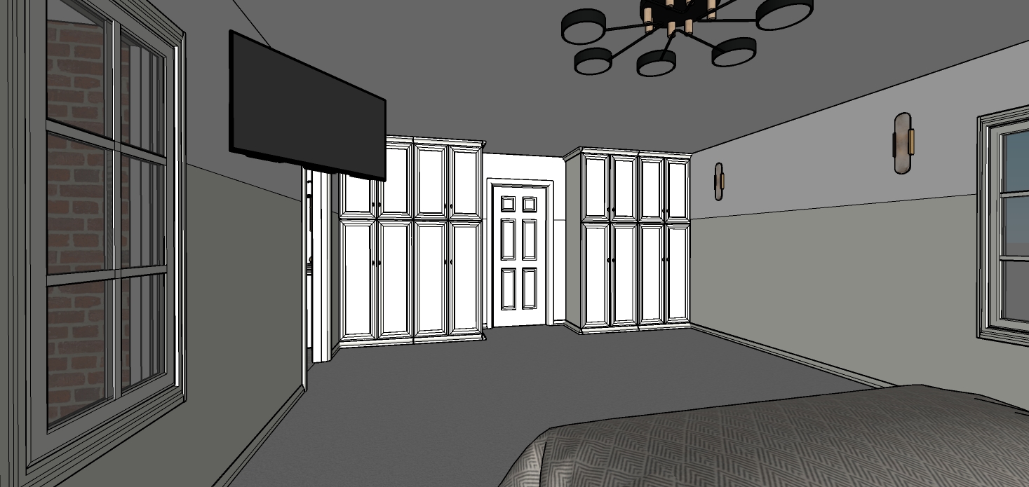 maintain all model geometry this should feel like a high end primary bedroom suite there should be a contemporary style ceiling light the casework door and trim should be painted in a semi gloss finish with the color from the original image decorate the room as a modern bedroom with modern window treatments a contemporary ottoman in front of the bed the carpet should be plush and look expensive the wainscotting should appear as white painted framed casework in a semi gloss finish add modern wall art the room should feel bright and airy do not add any windows that aren t in the original image