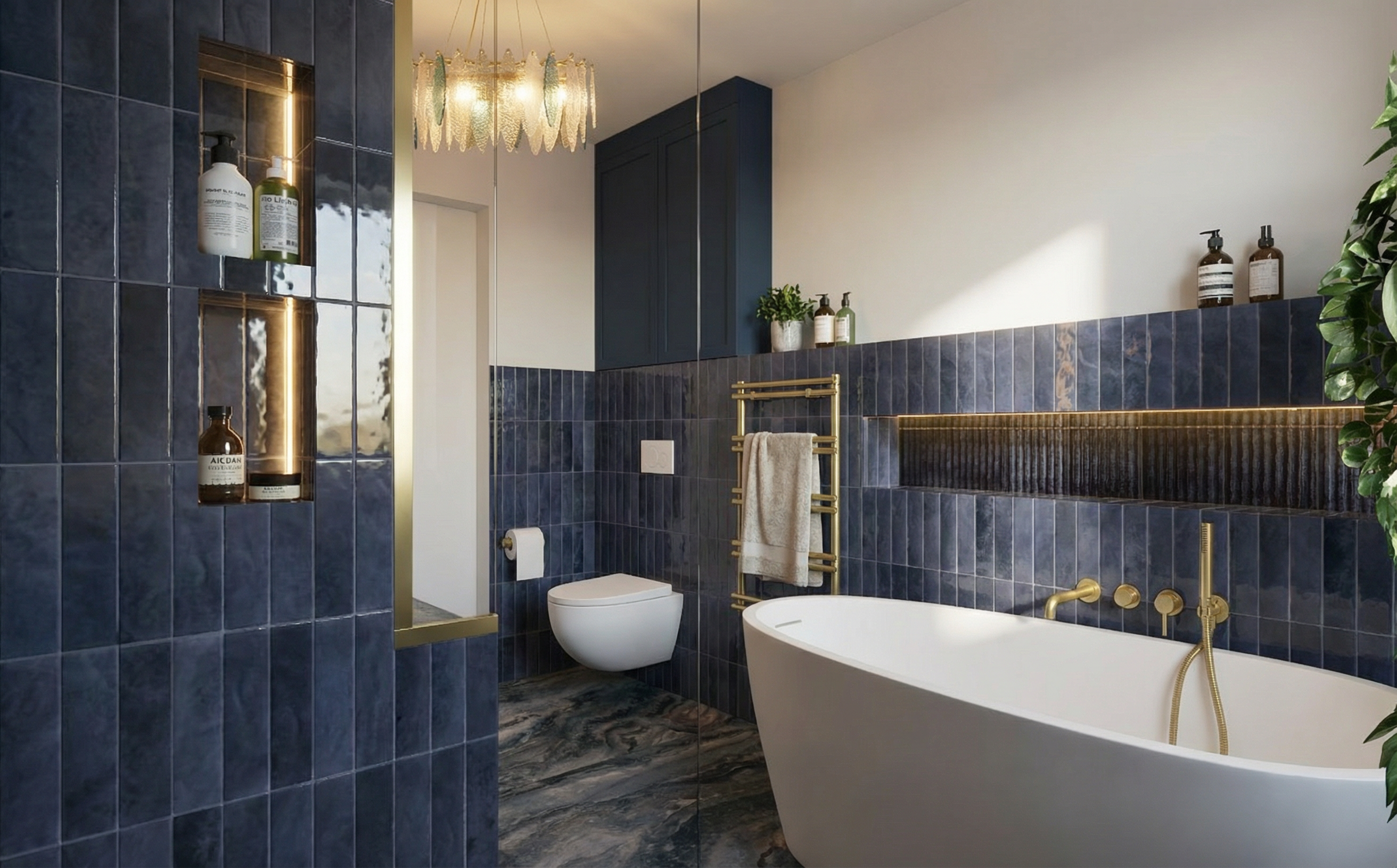 nie zmieniaj geometrii perspektywy tekstur mebli kolor w nie dodawaj adnych element w dekoracyjnych ani mebli szafki s lakierowane matowym lakierem kafelki s polerowane p ytki pod ogowe s matowe po lewej stronie od wn k na kosmetyki pod prysznicem w naro niku jest pionowy profil led po prawej stronie poza kadrem jest malutkie okno wanna wc i przycisk wc s bia e matowe we wn ce z kosmetykami pod prysznicem nie ma pod wietlenia popraw wizualizacj eby by a hiperrealistyczna
