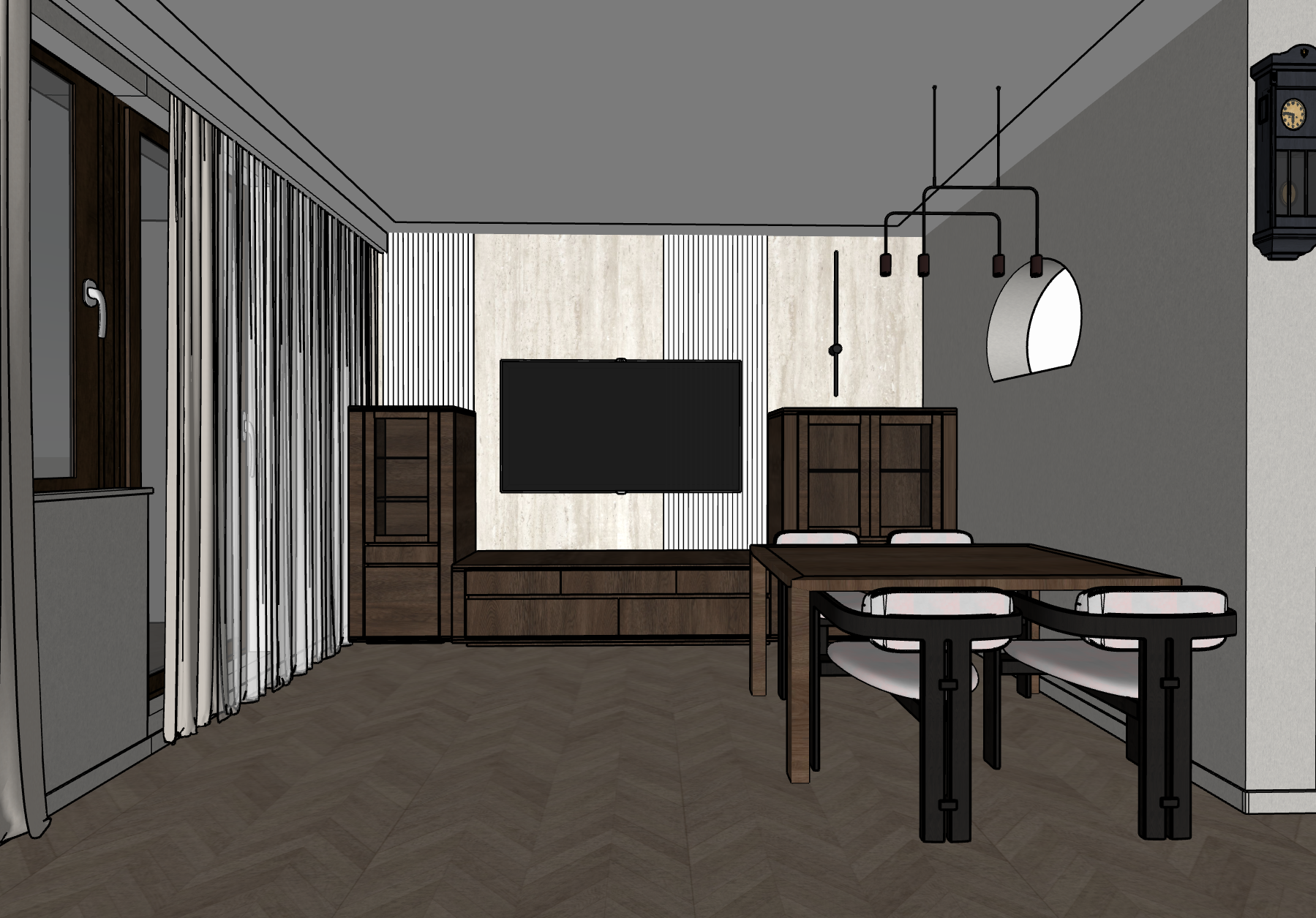 add a light behing a tv change chair material to velour flip the ceiling so there is no indentation but the other way around with led on the edges to make it realistic change the velvet color on the chairs to a light shade add some plates on the table and add some elements in the cabinets with a realistic beige herringbone floor