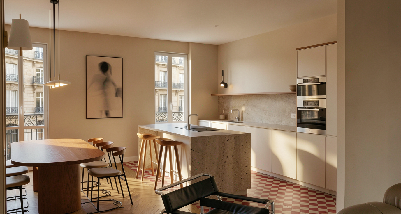 international style interior shot this is a kitchen the kitchen island must have a stainless steel top and possibly also the cabinets onder the top architecture