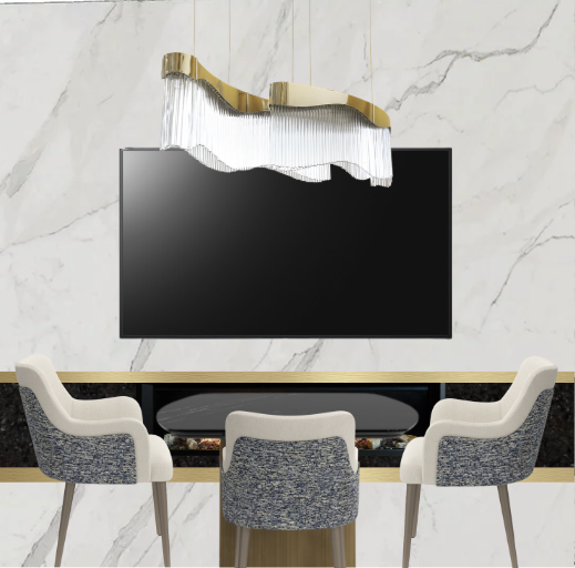 prompt create a front facing orthographic interior elevation no perspective no depth of a modern luxury living room wall camera perfect flat elevation view no perspective distortion centered and symmetrical composition main wall full height white marble slab wall with soft gray veining large seamless panels matte satin finish tv large black flat screen tv centered flush mounted minimal frame fireplace linear fireplace directly below the tv built into the wall surrounded by a thin brushed metal inlay warm brass tone very minimal and sleek subtle flame visible chandelier sculptural wave shaped chandelier centered above brushed gold metal frame hanging vertical glass rods with slight variation in length include thin suspension cables and a ceiling canopy make it look properly installed not floating furniture 3 lounge chairs aligned in front ivory upholstery with textured blue backs keep them visually flattened to match elevation style lighting even soft lighting architectural elevation style minimal shadows gentle glow from chandelier and fireplace materials clear marble veining soft fabric texture on chairs subtle metallic reflection on brass elements style clean minimal luxury looks like revit sketchup elevation but with realistic materials no console no extra elements no depth no perspective