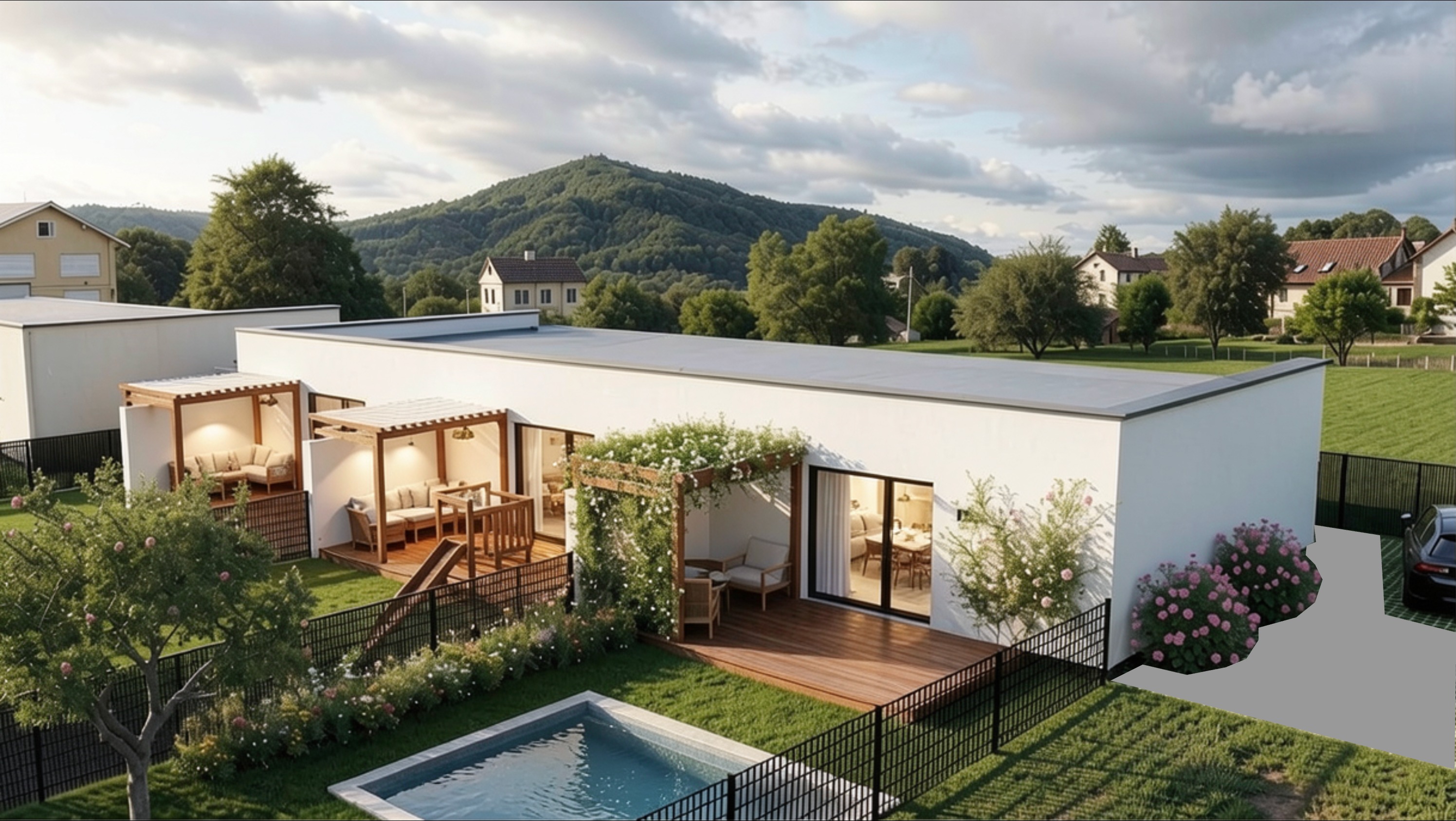 v prav sti obr zku je vy len n ed plocha nam sto t to ed plochy a pouze tam vykresli betonovou skl danou dla bu v barv p skov s obrubn ky kolem ke a zatrav ovac ch dla dic v prostoru parkovac ho st n pod autem