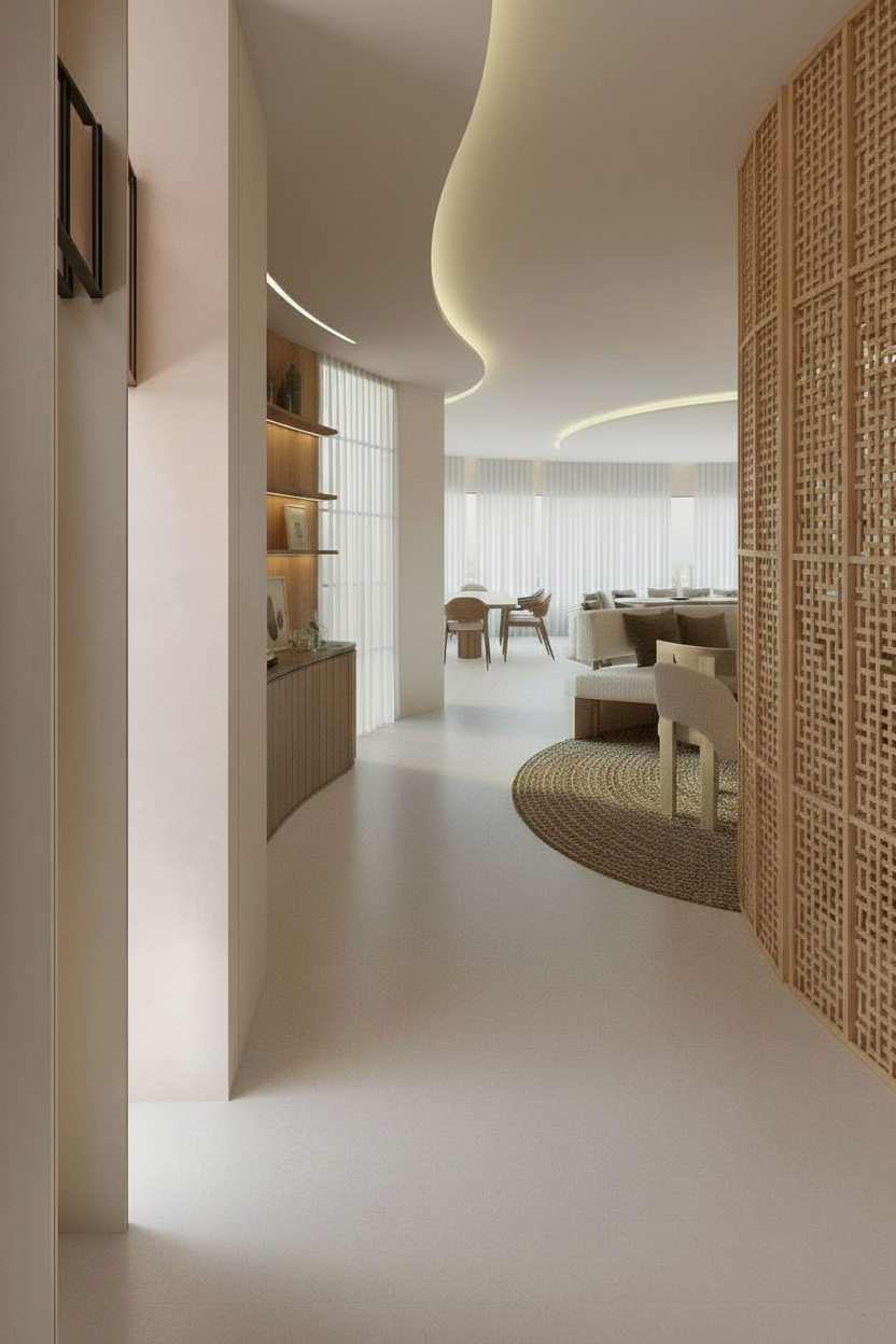 add a display shelf behind the banquet seating that curves around it the screen starts from the middle of the banquet seating to the right curving behind it it is made of light coloured timber keep the exact format camera angle and aspect ratio of the original image image must be in landscape format