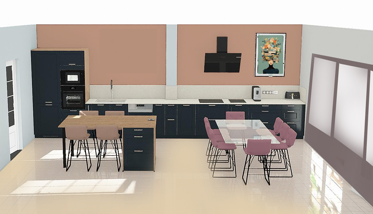 sol en carreaux beige ros plusieurs suspension verres sur l il t de gauche baie vitr e couleur noir droite plus lumineux clairage allum pas de hotte a gauche