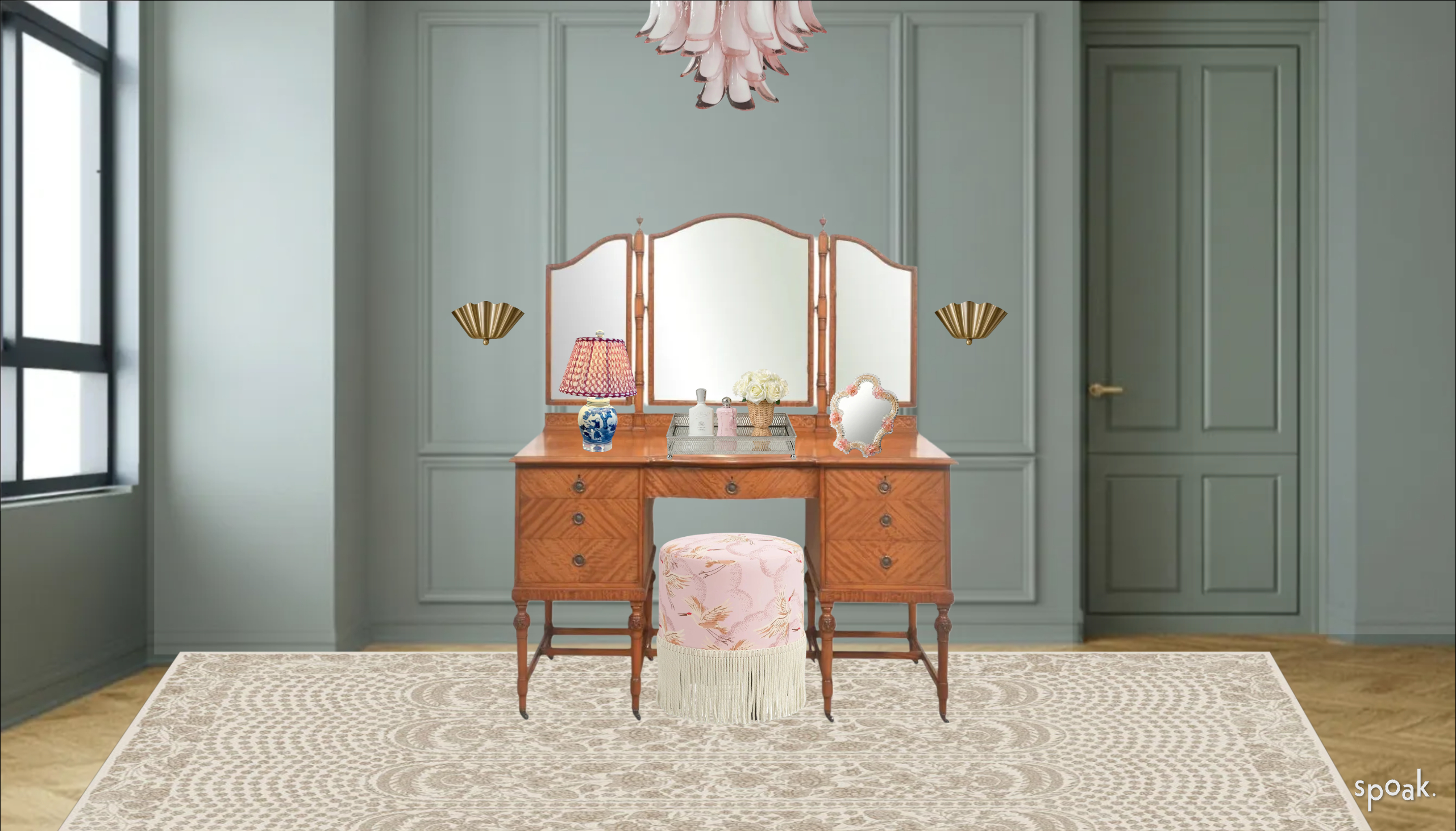photorealistic architectural editorial photography enhance physical realism only do not alter objects geometry layout materials patterns artwork or color values preserve all original design elements exactly as provided add accurate natural light behavior with soft directional window light physically correct shadows with contact shadowing at base of objects realistic light falloff and depth subtle ambient occlusion in corners and where surfaces meet enhance material realism true to life fabric texture and weave detail natural wood grain depth realistic glass transparency and refraction accurate metal reflections mirror surfaces must reflect adjacent wall and environment correctly add lens realism slight depth of field very subtle natural exposure balance soft highlight bloom fine film grain micro surface imperfections editorial photography quality similar to architectural digest maintain original composition no stylization add subtle gravity and weight to fabrics and objects natural fabric drape and realistic object grounding do not alter shape color of perfume bottles lamp or flowers