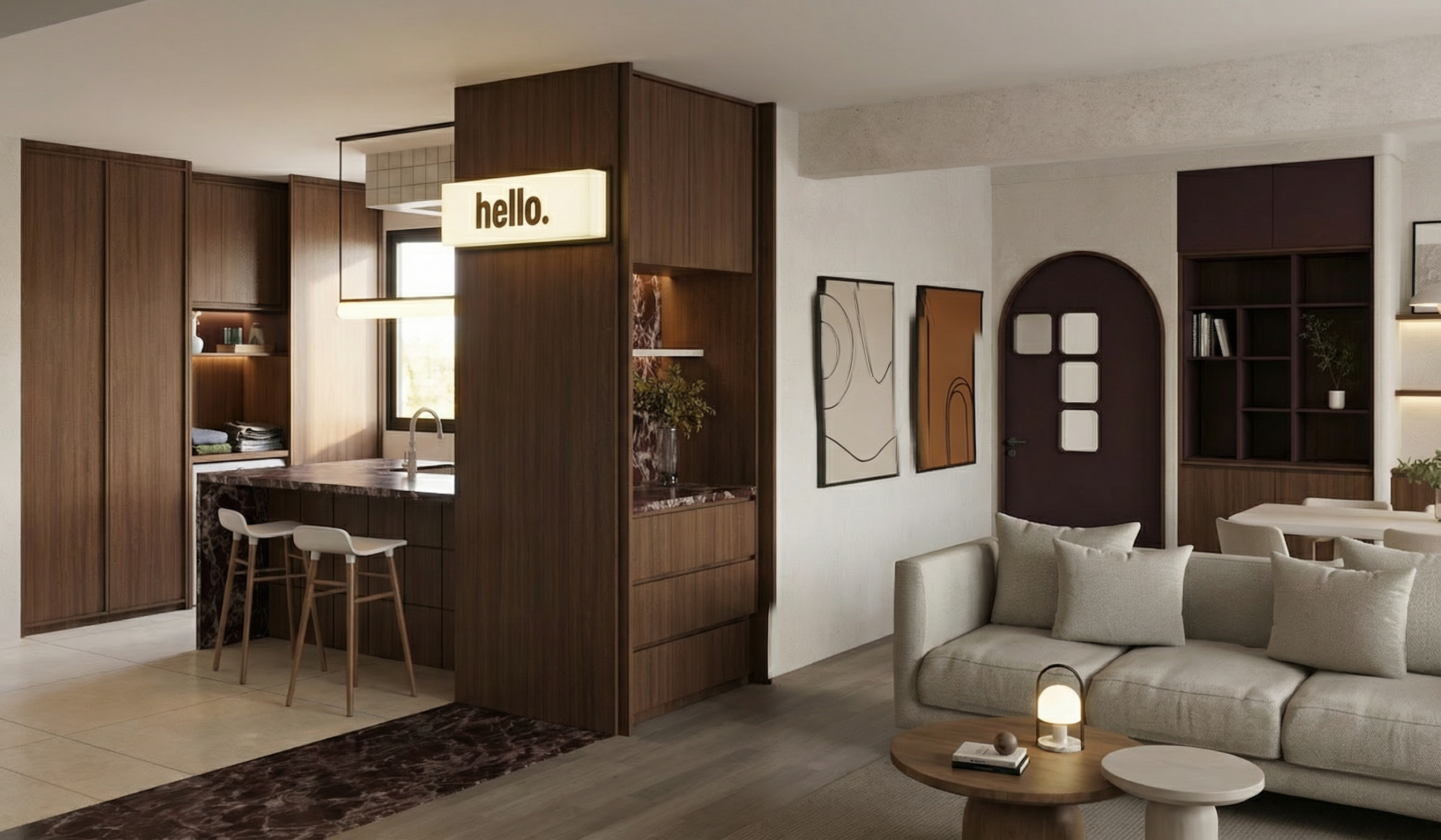 colours and texture to remain accurate as per original picture kitchen in 900 x 900 muted light beige tiles living room in muted light brown vinyl in between kitchen and living in dark maroon marble large tile hello lightbox countertop in dark maroon marble walls in off white subtle texture door in dark maroon purple plain laminate top hung at shelvings in dark maroon purple plain laminate 4 small squares at open shelving backing in dark maroon purple plain laminate other carpentry in dark brown laminate