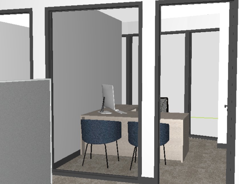 make photorealistic rendering keep all finishes the same and all architecture the same wood tones should be a lighter and a little bit grey make ceiling a standard 2x2 office grid with lights view outside windows is city