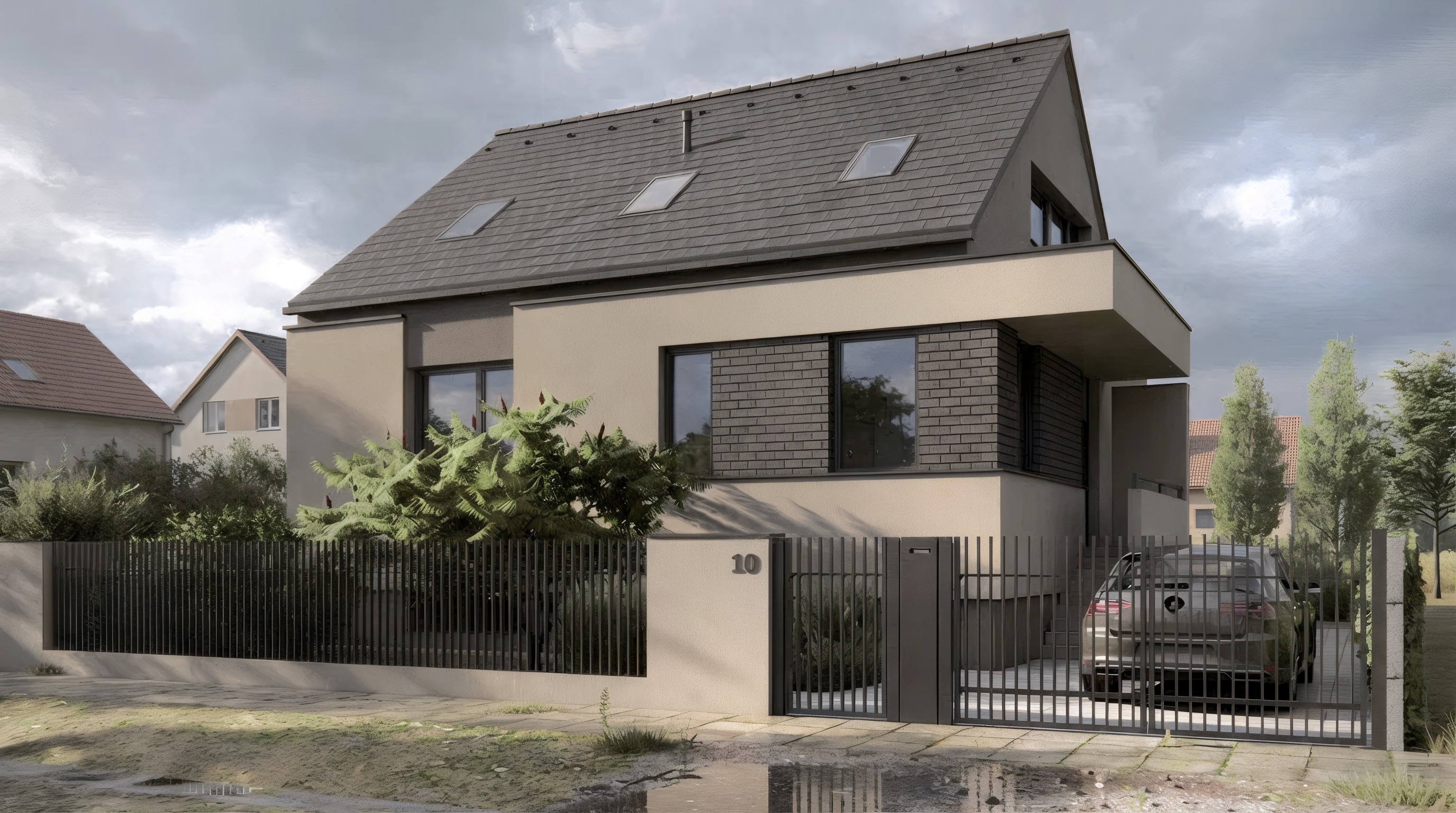 nothing should change in the picture it should only be a night picture the lamps are on in the rooms and the garden lights are also on there is dim public lighting on the street there is a naturalistic moon in the sky in a slightly foggy environment