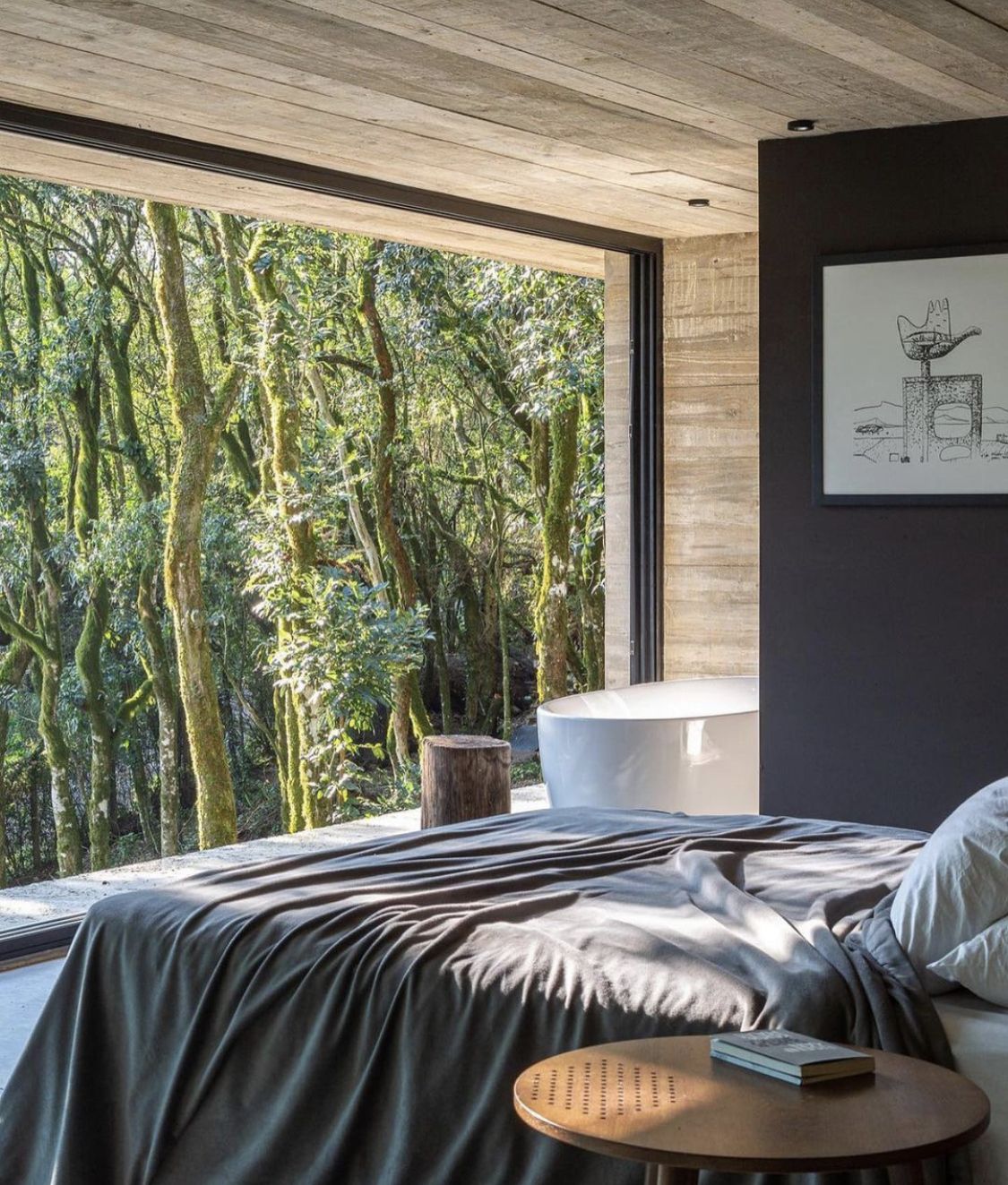 walls not made of wood but neutral and as a landscape mountains in the distance