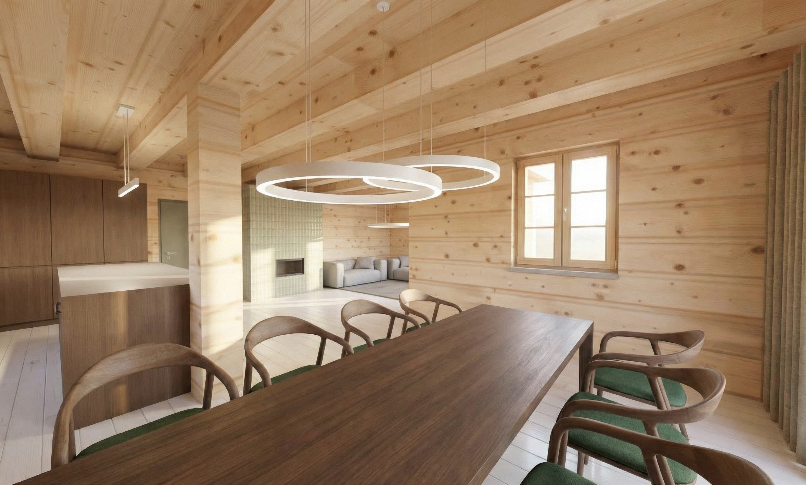 modern mountain cabin with white floor only other colour are green seats on the wooden chairs and plain brown colour kitchen with kitchen isle all lightings are white remove black lighting correct the kitchen based on the original concept correct the kitchen as it is on the original picture