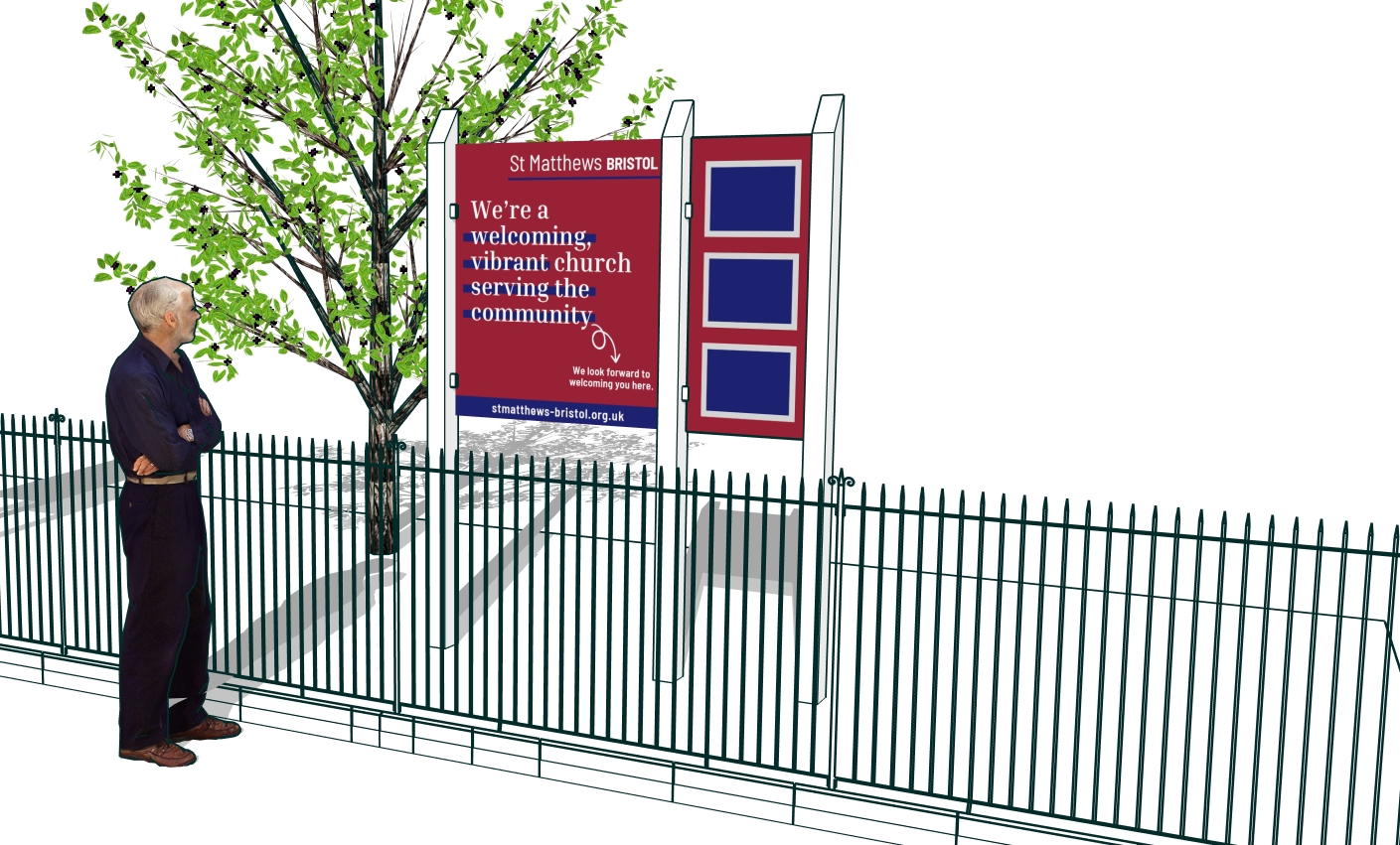 render this image of a church noticeboard include oak posts tarmac pavement in front of railings railings painted black grass behind railings