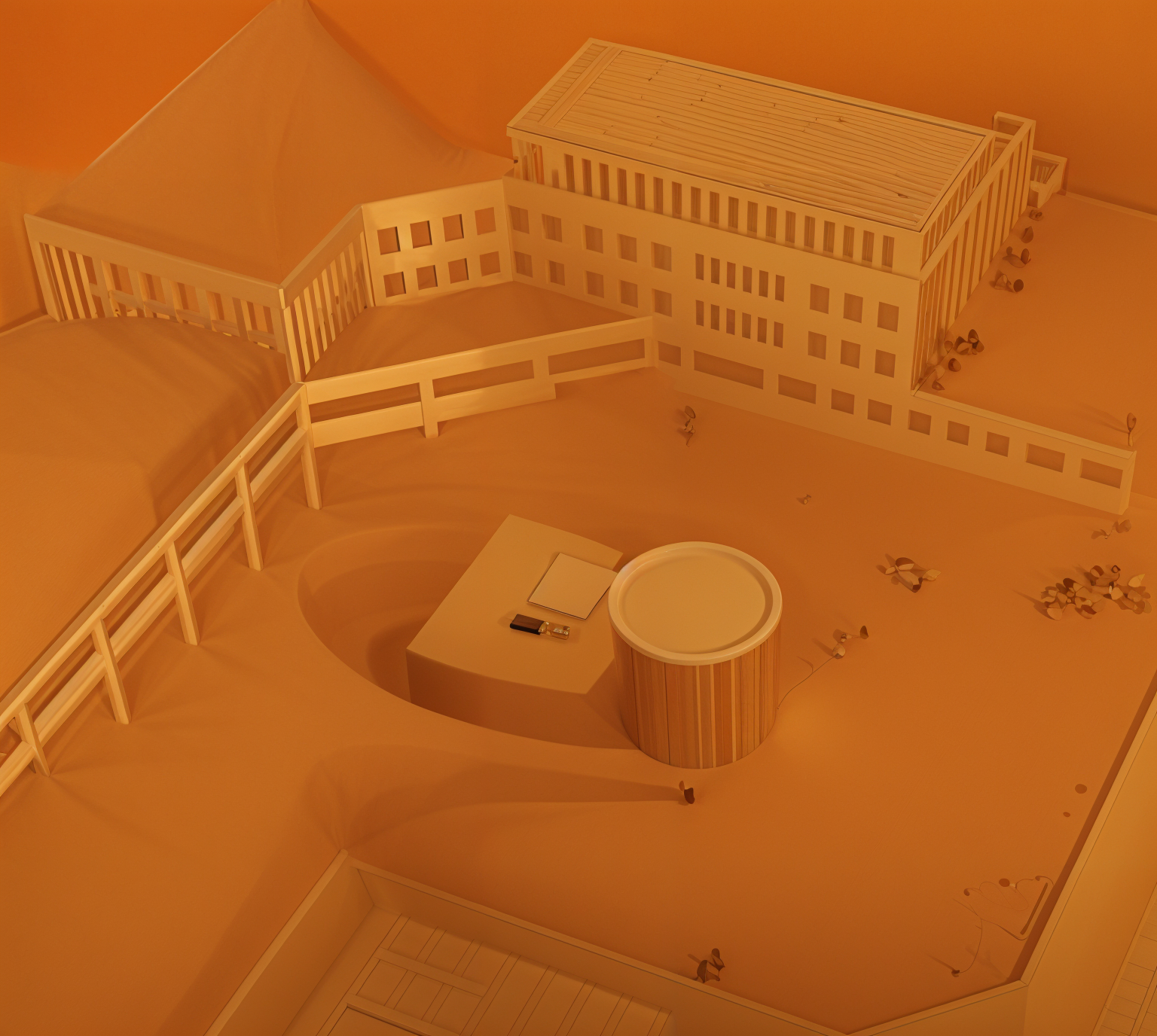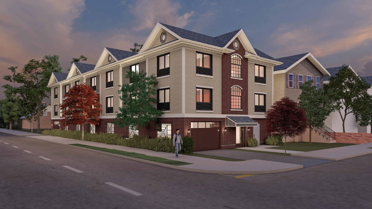 update the ambiance to a photorealistic image kee all original features of the building show people walking on a sunny autumn day with a few clouds and a beautiful day