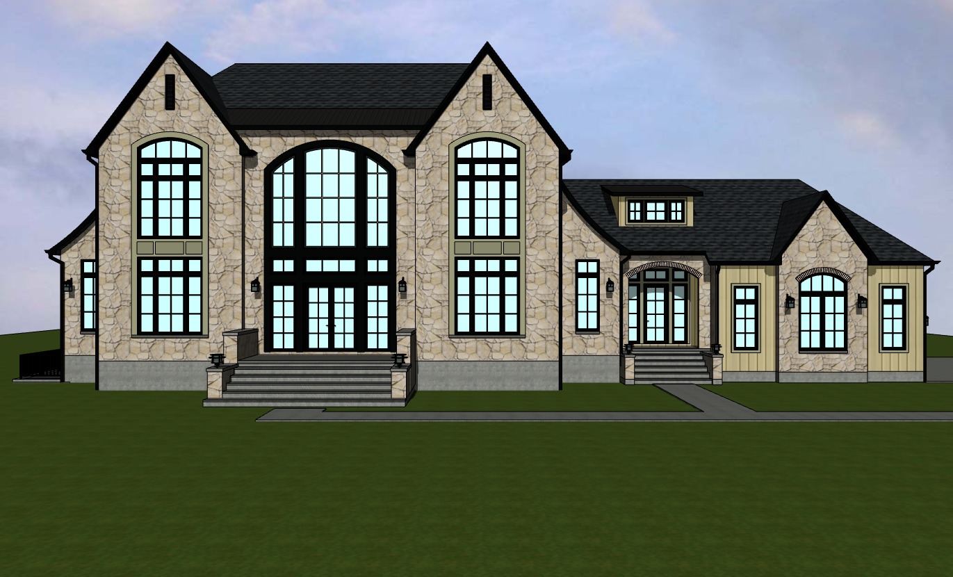 modern european home large modern earth tone stone black window frames black gutters and downspouts black shingles with black metal roof accents straight on elevation rendering view