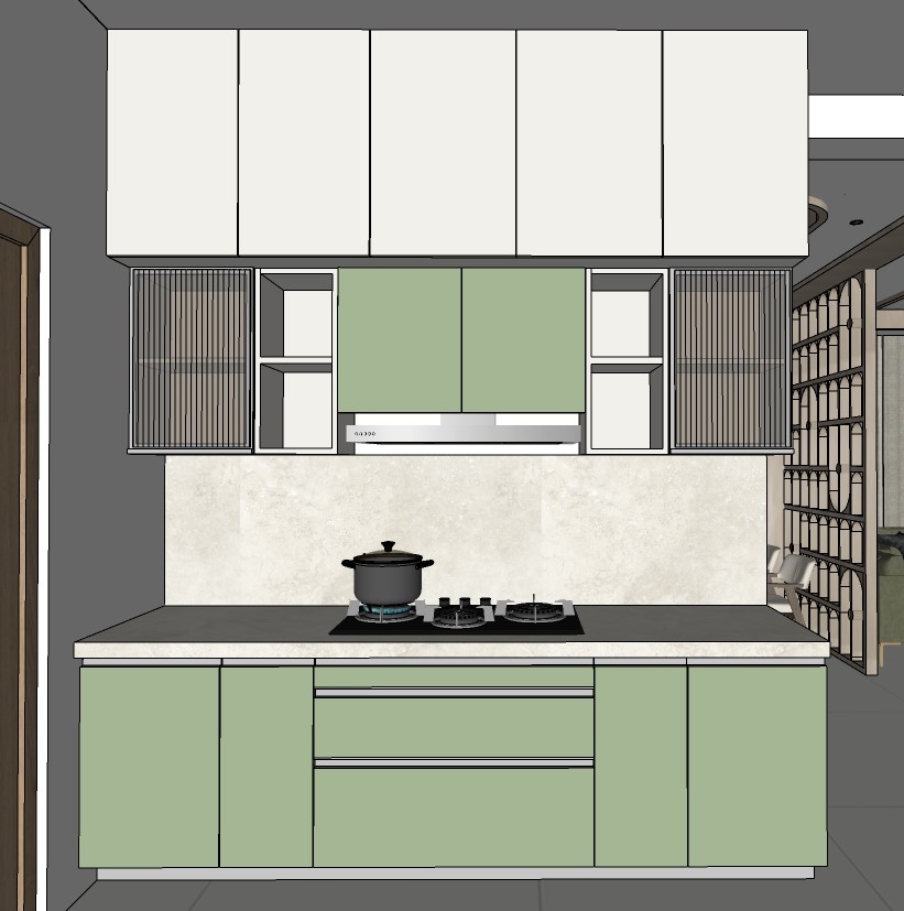 create a highly realistic interior render of the kitchen as per the provided view maintain all existing colors materials and finishes exactly as shown including cabinetry countertops and flooring without any alterations use warm white lighting 3000k to softly illuminate the space ensuring all light fixtures emit a natural balanced glow accurately render realistic reflections and light interaction on the fluted glass surfaces preserving their texture depth and translucency ensure physically accurate lighting subtle shadows and true to life reflections for a natural and premium visual outcome