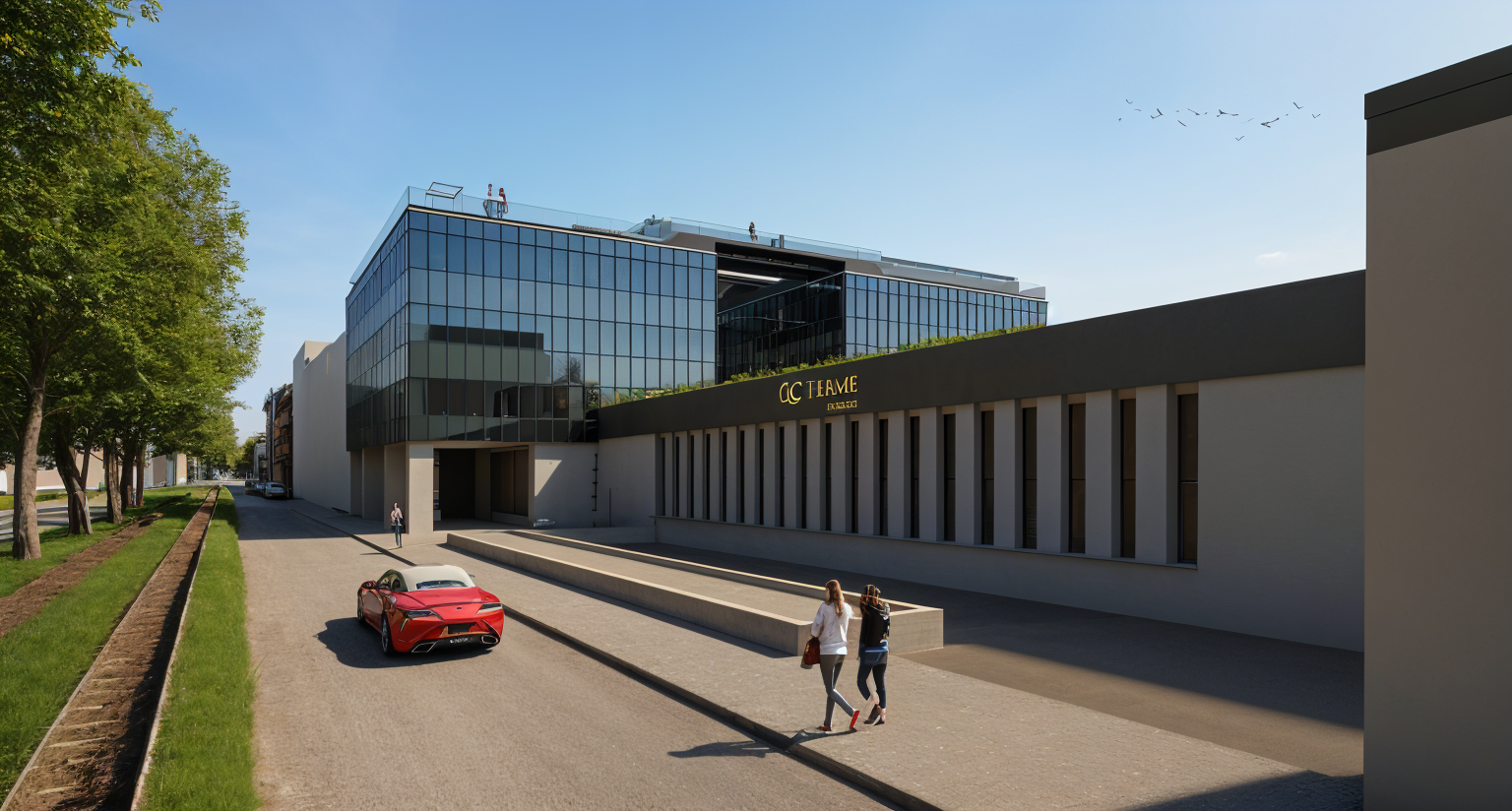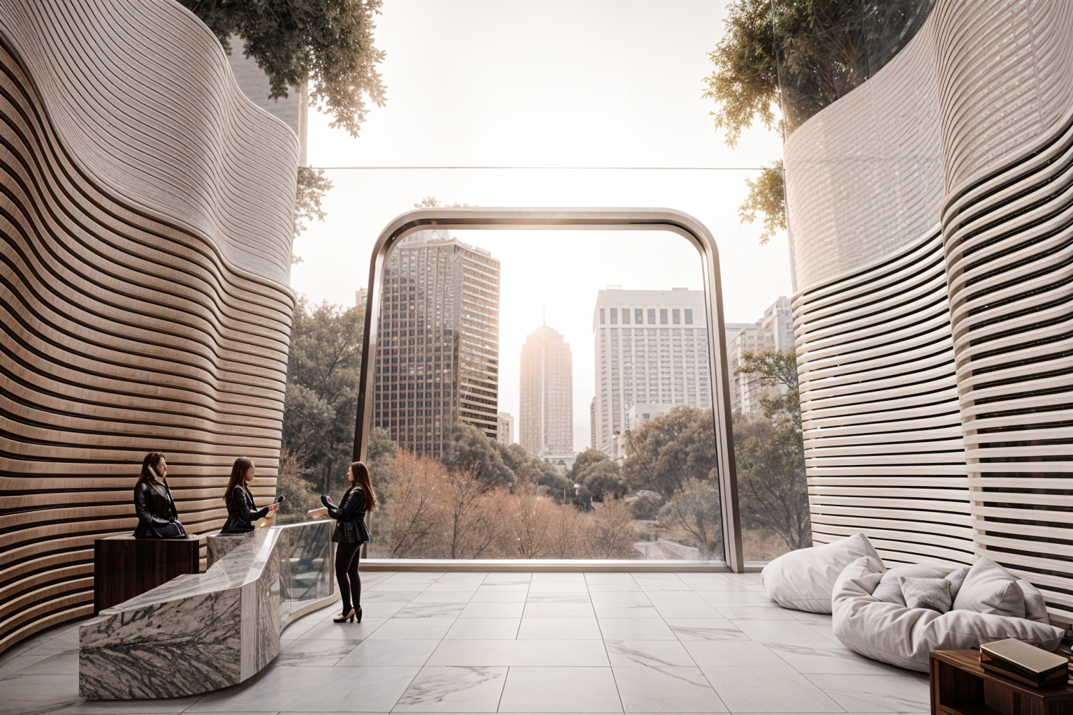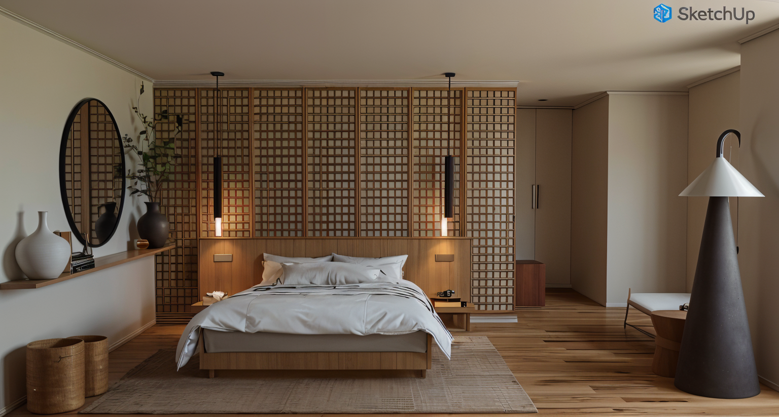 there is vertical placed wood in the panels in between te windows time of day is just before sunset trees are oak trees add a little more sun the building in front has a brick facade with wood in between windows