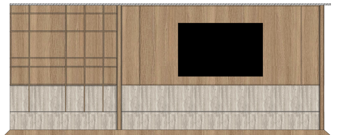 a luxurious and serene living room media wall featuring a travertine stone finish in the botom part and warm natural oak brushed with soft beige tv is samsung frame new generaton with soft matte reflection on the screen the atmosphere is calm and inviting with abundant natural light filtering through the window from the right side window is in aluminium black with beige linen curtain in front of it casting gentle shadows floor is natural oak cashmire color parquet wide 17 cm long 300 cm make it realistic and cast some shadow from the window shelfs should have some vases in black matte with books as well