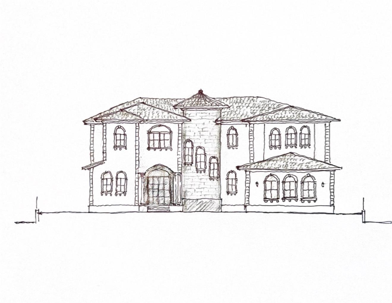 convert this sketch into an artistic rendering using pencil shade shadow and some light textures do not change any shapes or modify the building add paver driveway centered on the front door and two large shade trees on each side of the house