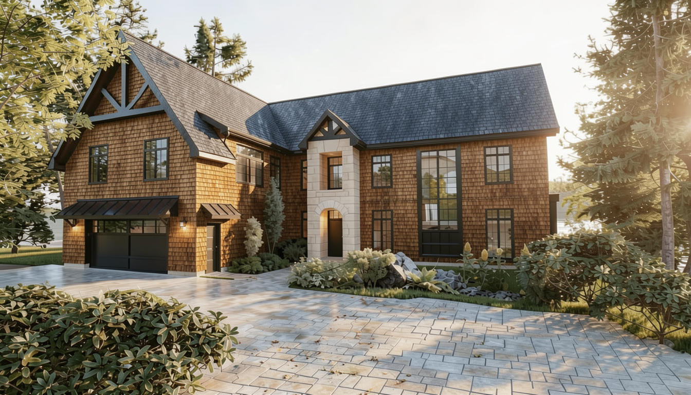 render a 2d exterior elevation of the building using the material palette and color tones from the reference photograph keep the elevation fully visible do not cover with vegetation roof should be asphalt shingle in slightly brown tone not gray dormers with copper roof front siding with clean crown molding include realistic background with sky and trees add schematic subtle vegetation that matches the reference photo s style keeping it 2d and not cartoony ensure materials and tones accurately reflect the reference image including shadows highlights and texture cues