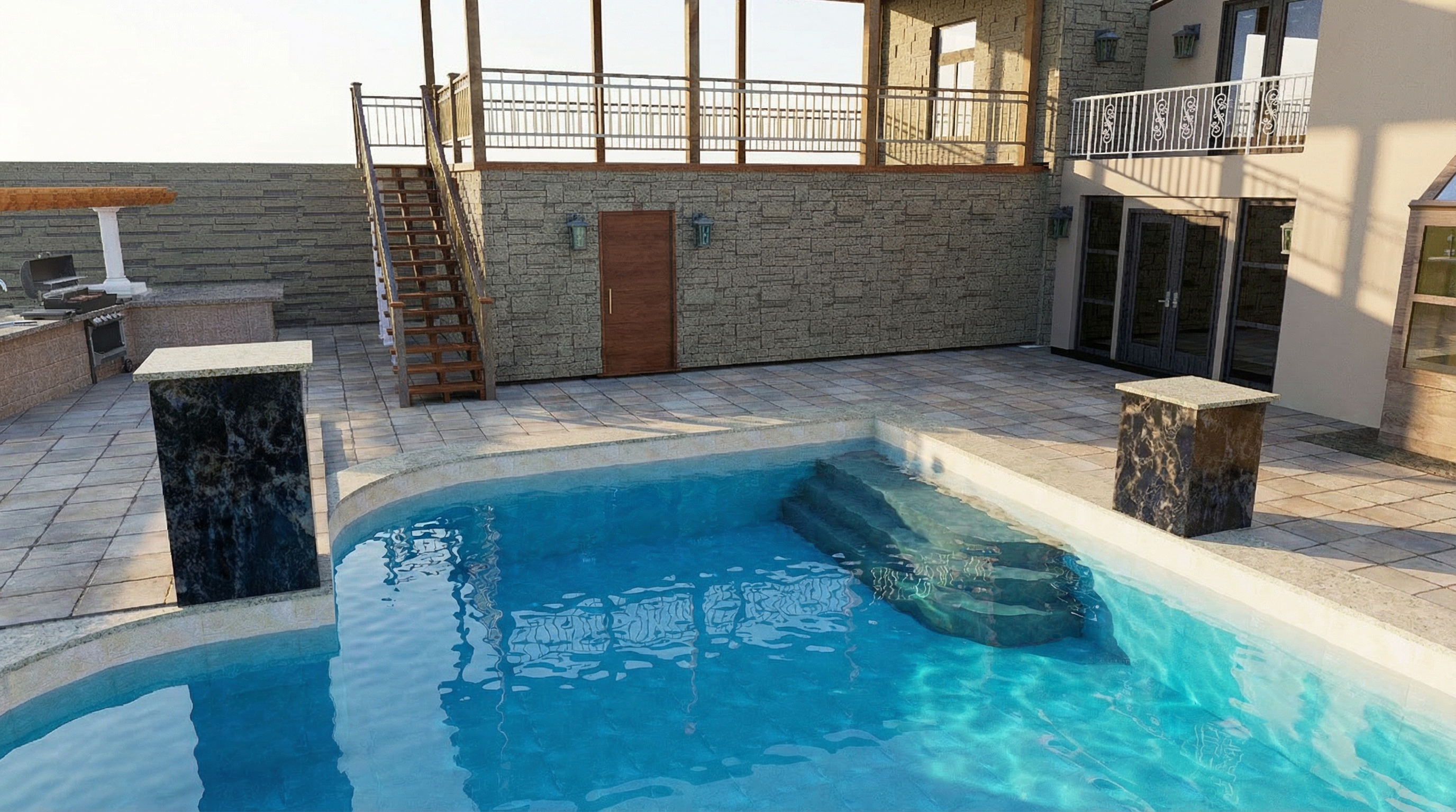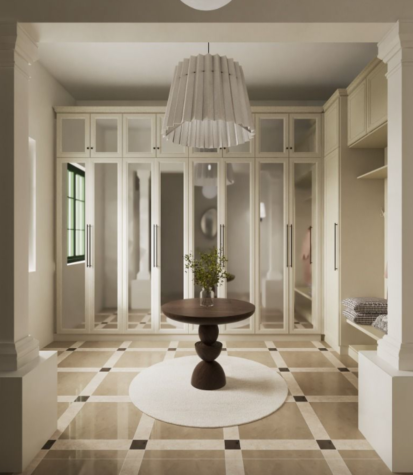 ultra photorealistic interior render of an elegant dressing room with classic architectural detailing soft natural daylight entering from the side window realistic light falloff and subtle shadows high quality global illumination physically accurate materials and textures cream coloured built in wardrobes with glass doors showing realistic reflections slight imperfections and depth behind the glass natural stone floor tiles with subtle variation micro surface texture and soft reflections dark stained wooden round table with realistic wood grain and soft wear fabric pendant lamp with natural textile texture visible weave and gentle translucency refined neutral colour palette warm and calm atmosphere perfectly balanced exposure realistic white balance no over sharp edges shot with a full frame camera 35mm lens eye level view shallow but natural depth of field cinematic realism magazine quality interior photography